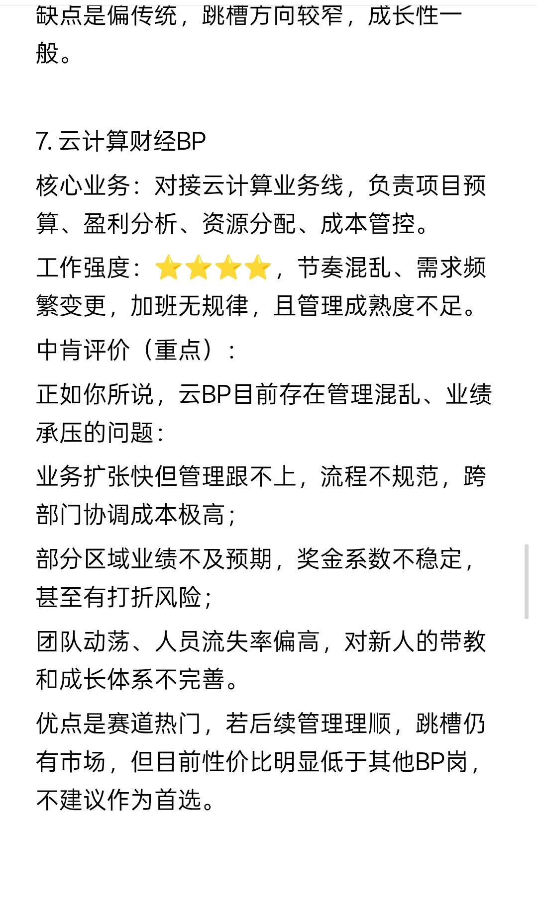 缺点是偏后台,和业务接触少,天花板不如业务线BP高。