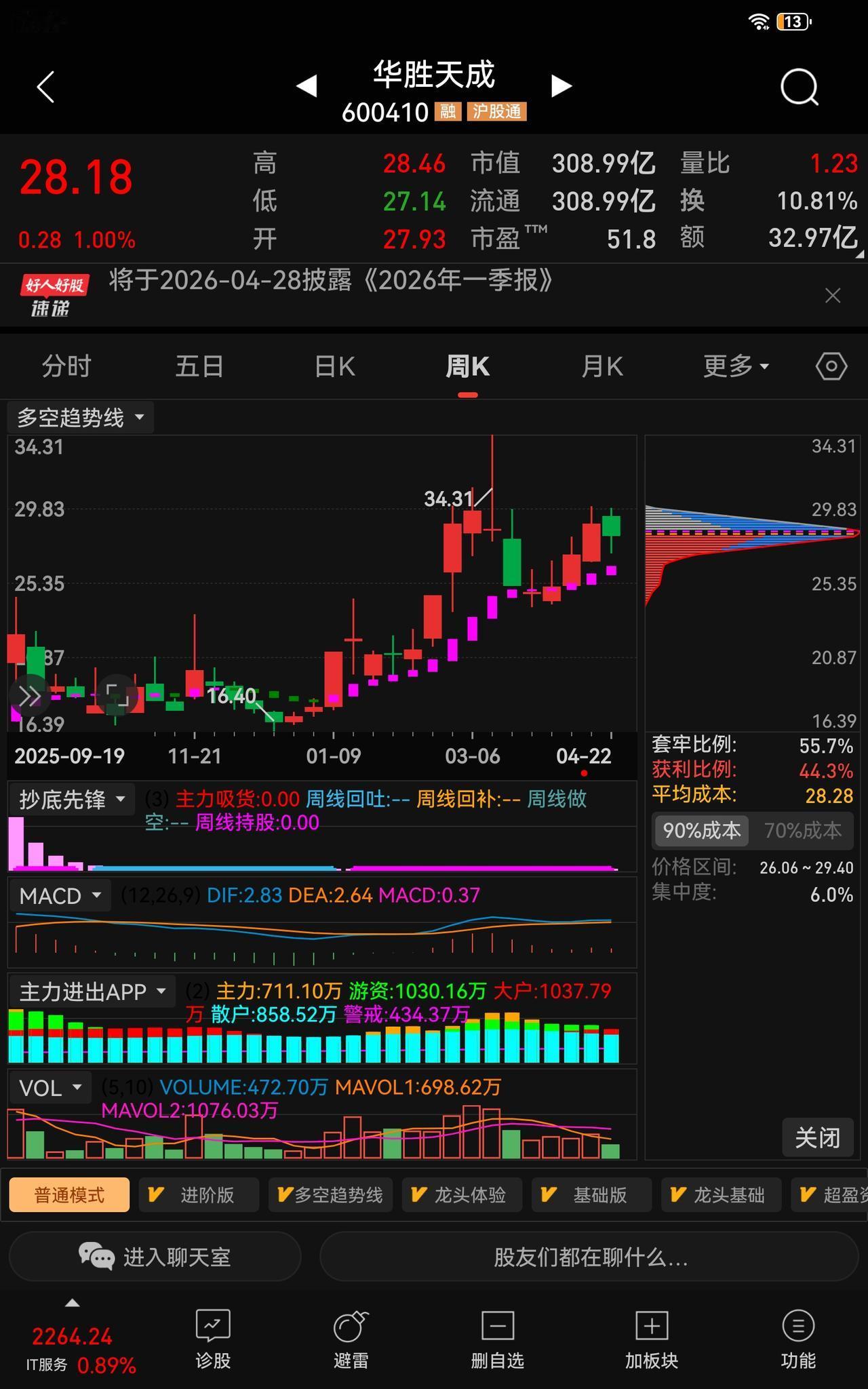 将于4月28日同步披露2025年年报与2026年一季报,业绩落地前夕,资金观望情绪升温,短期走势大概率以震荡为主。