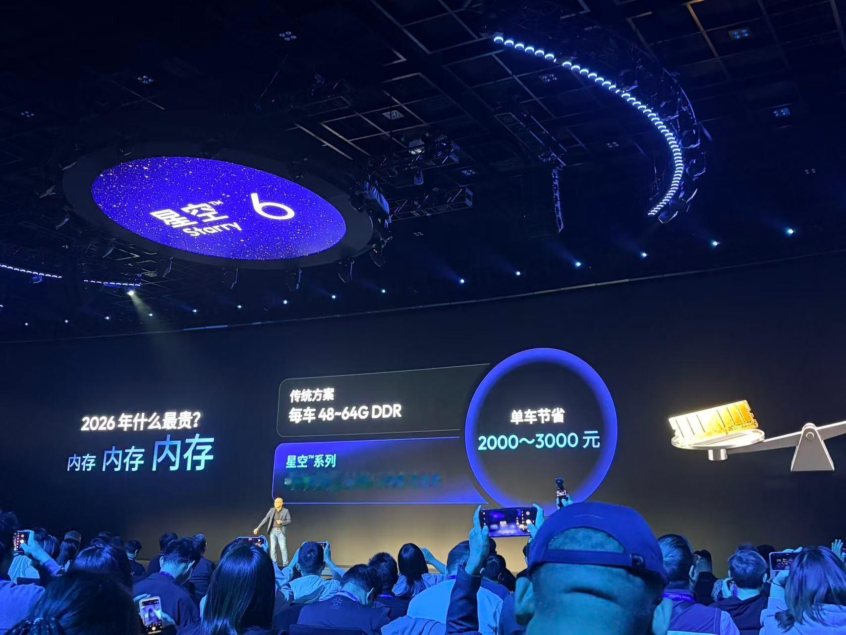 星空芯片的优势体现在,空间能节省50%,器件节省50%,整体成本更省,一台车能省1500-4000元,余凯现场算了一笔账,传统方案每台车要用48-64G内存,星空系列只要28-40G,内存单车能省2000-3000元中国首款整车智能体芯片星空汽车资讯
