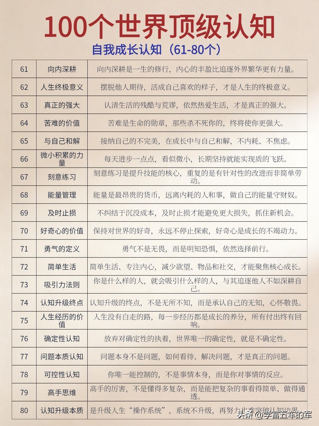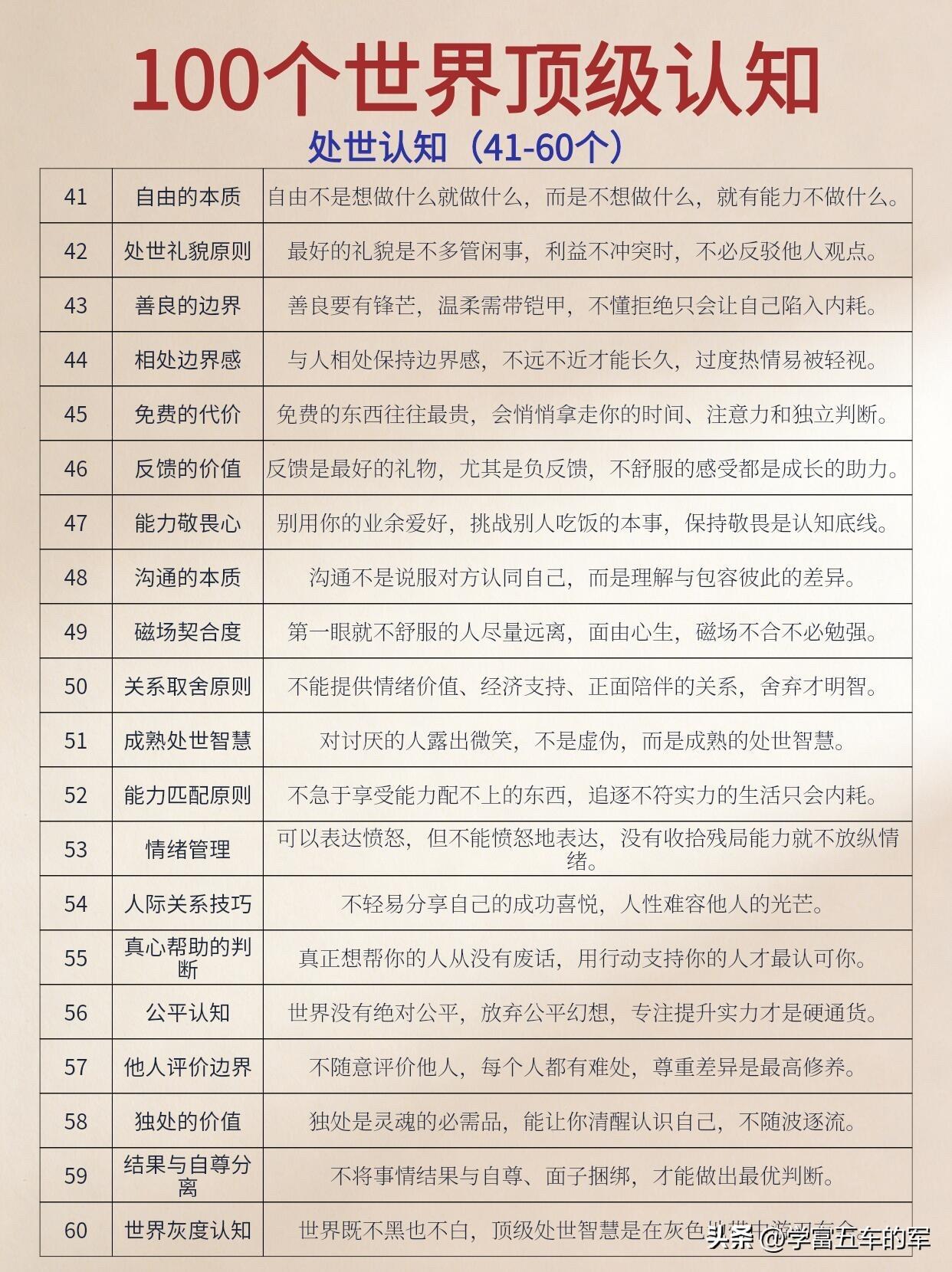 慢慢的,我不再被羊群效应裹挟,也不再因损失厌恶内耗。我学会了向内深耕,接受自己的不完美,也懂得了及时止损。原来人生的每一次突破,都是认知的升级。就像有人说的,认知边界就是你的财富和成长边界,不打破它,再努力也只是原地打转。现在我终于懂了,所谓顶级认知,不是懂多少大道理,而是用这些底层逻辑,过好清醒、通透、不内耗的一生。