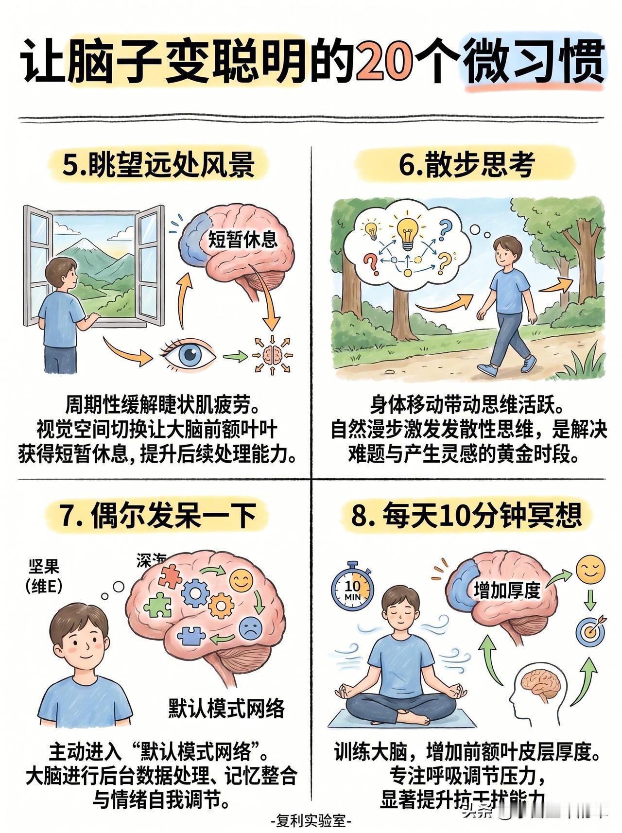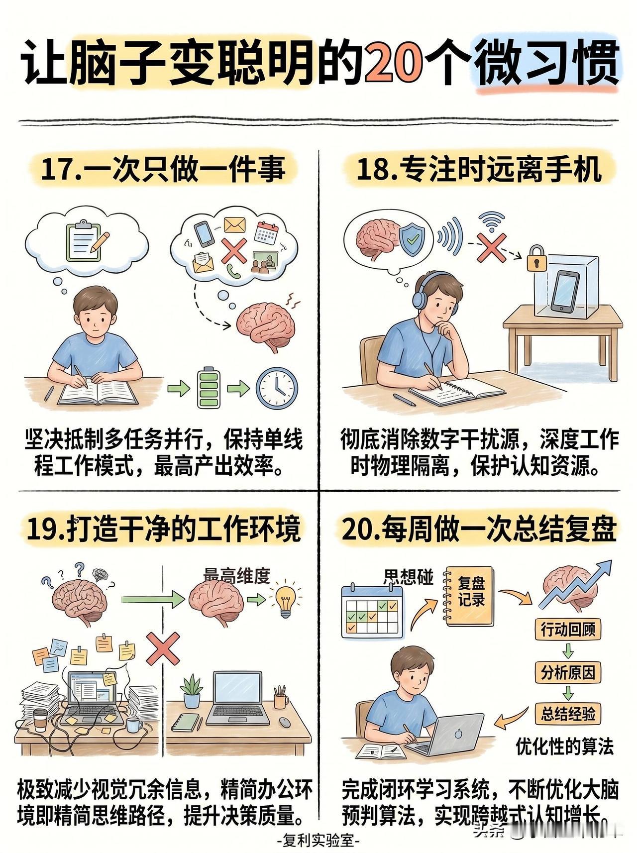 我试着每天早起晒5分钟太阳,每小时喝一杯水,吃几颗坚果;工作累了就远眺窗外,周末散步时顺便想想难题,偶尔发呆让大脑后台整理信息。每天10分钟冥想、20分钟阅读,用左手写字、多问几个“为什么”,学完东西就写下来,再用自己的话复述给朋友听。我关掉手机通知,一次只做一件事,每周做一次复盘,连书桌都收拾得干干净净。