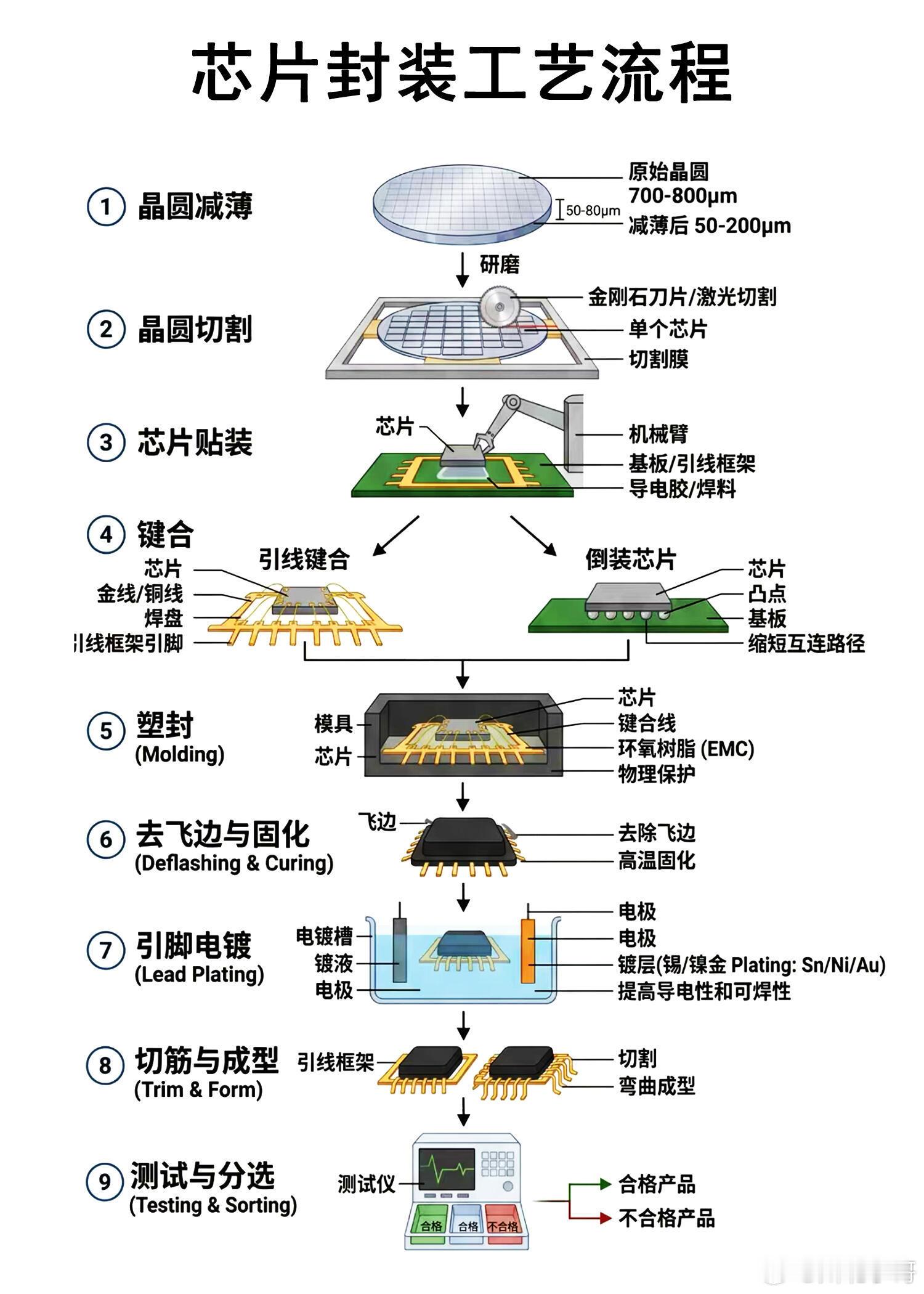 芯片封装工艺流程大揭秘!一颗芯片的诞生,绝不只是晶圆上的微小电路那么简单。从晶圆到成品,封装是赋予芯片“生命”与“躯体”的关键一环。