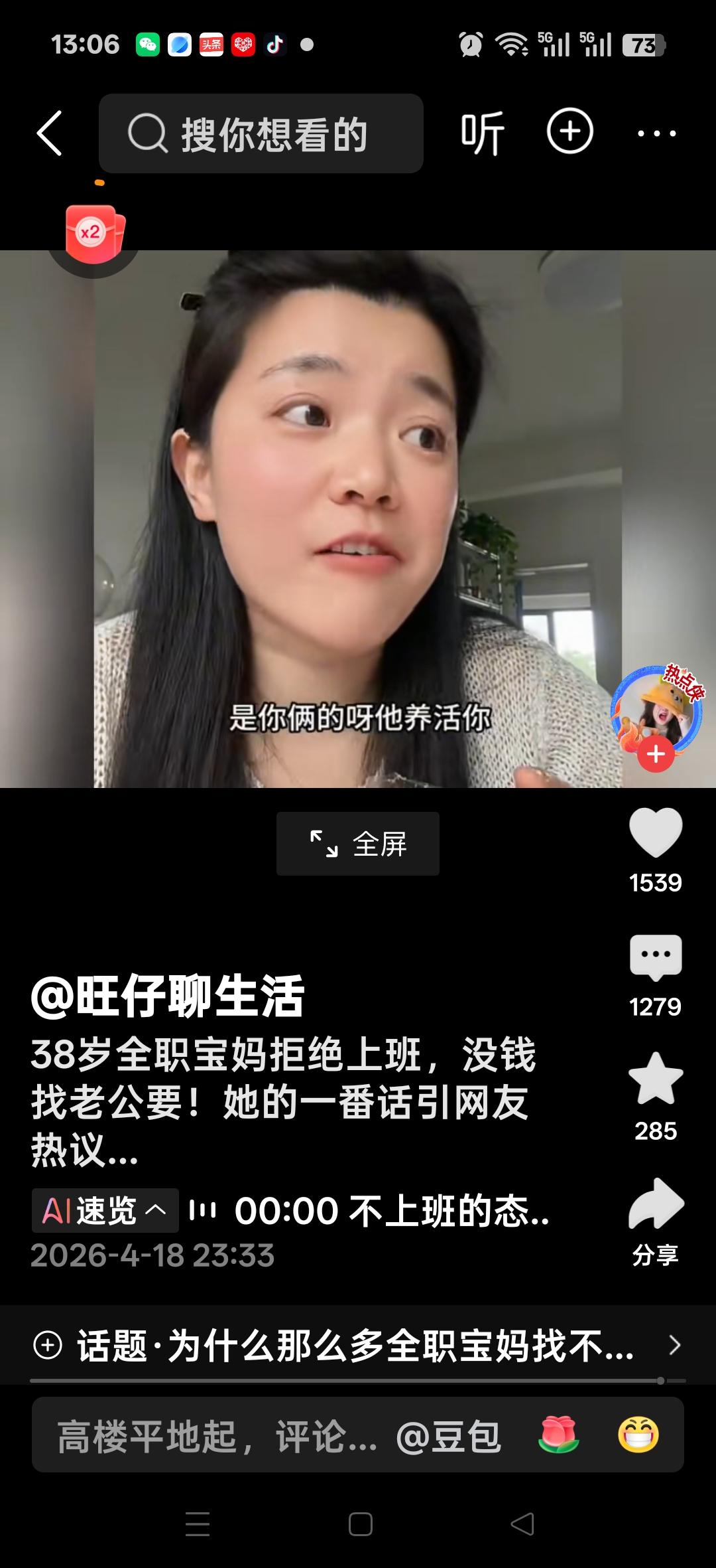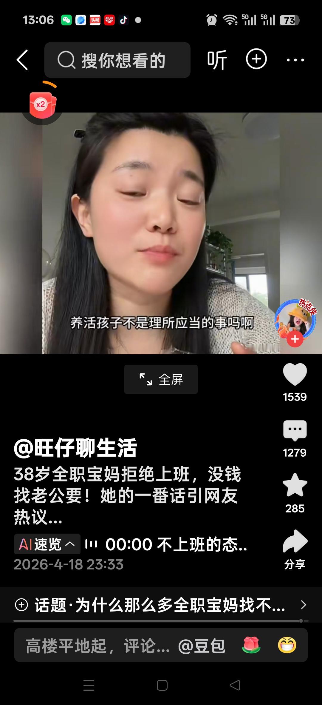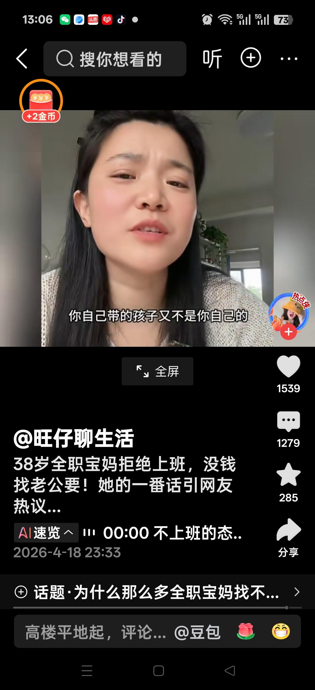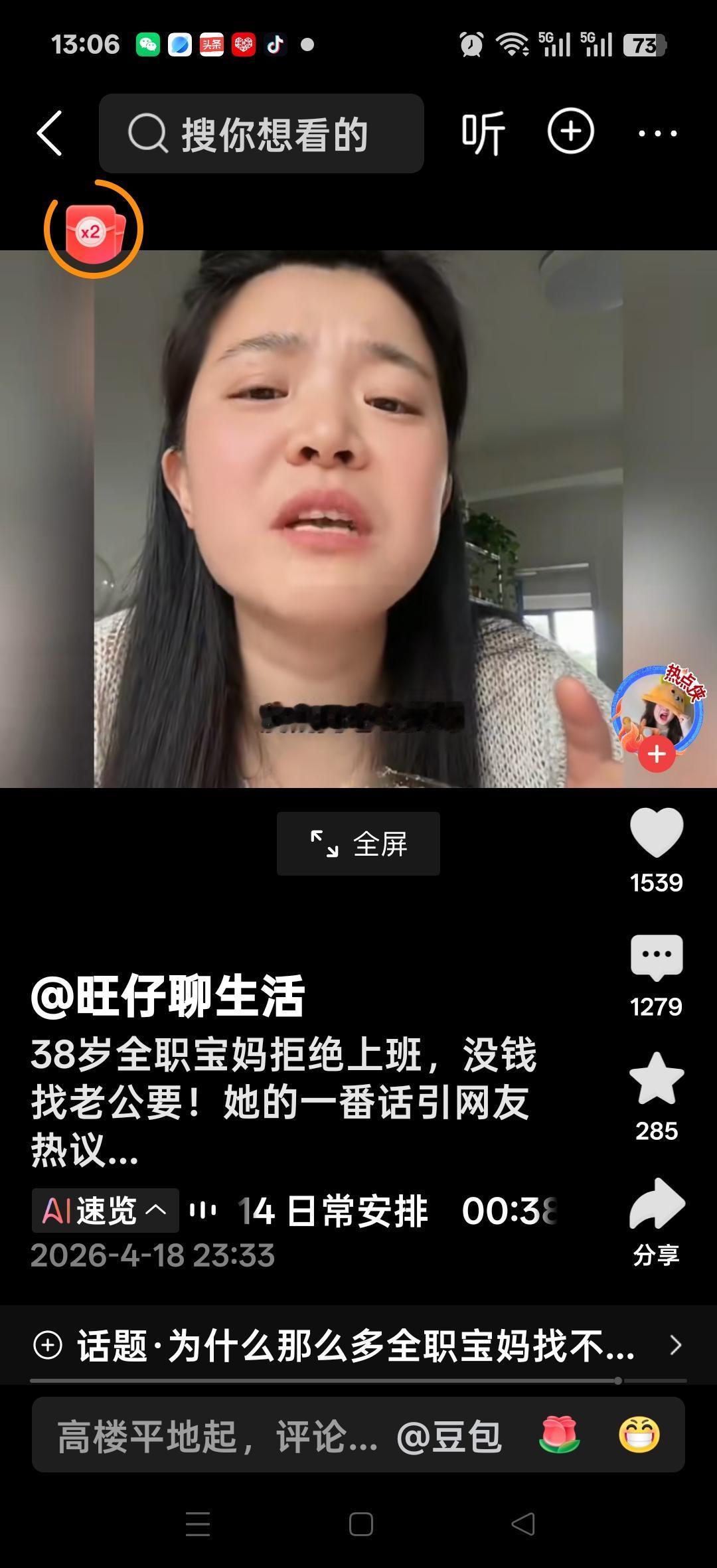 38岁全职宝妈拒绝上班,没钱找老公要……。网友说:虽然我老婆也不上班,我也没想让她上班,但是说实话家里的事,看起来很多很杂,其实也就那么回事,主要还是逍遥自在习惯了,看破不说破没啥对错,相互理解接受就好。有的人说:当你到了退休年龄的时候,看到别人拿退休工资,你不要后悔就好,世上没有后悔药呀!有的人说:认知不同的人,可以说是两个物种,我就是另外一个物种,婚姻和男人我选一万次,也是选工作!必须独立,必须挣钱。有的人说:我很喜欢上班,不是因为喜欢上班的内容,而是上班有钱存,社保有人交,用钱更有底气,趁年轻多攒点钱……,大家说是这样的吗?