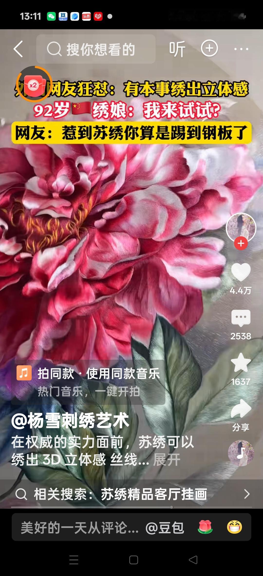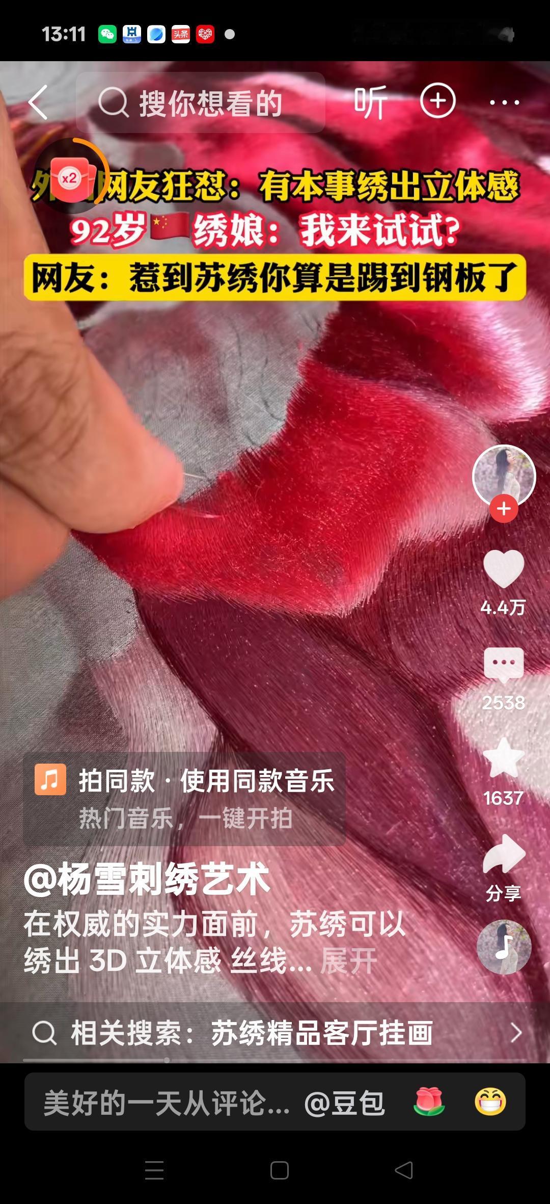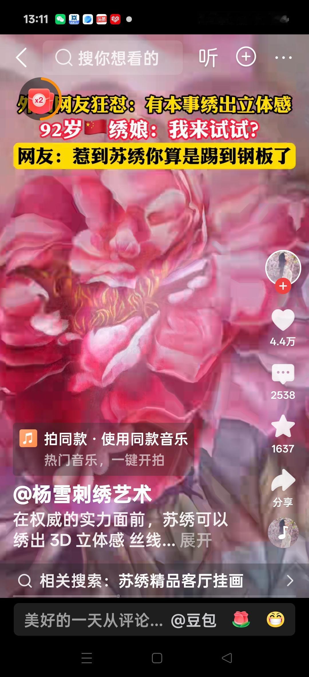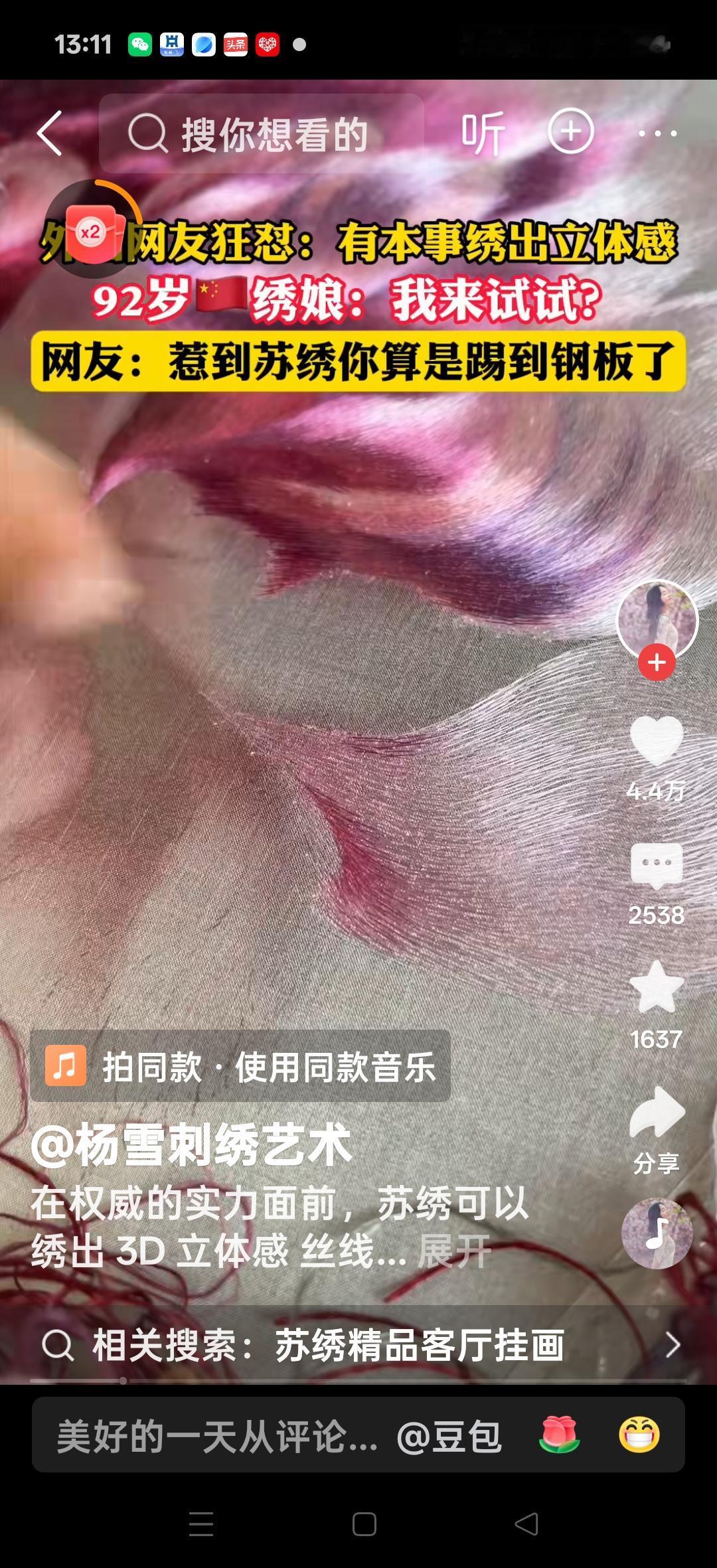 外网网友狂怼:有本事绣出立体感,92岁绣娘:我来试试,在权威的实力面前,苏绣可以绣出3d立体感。网友说:惹到苏绣,你算踢到钢板了。网友说:我母亲的师傅就是苏州的绣娘,不过是用缝纫机绣花,带的徒弟无数,只有我母亲学出来了。68年曾参加过湖北省绣花大赛,作品是百鸟争鸣图,一只凤凰99只各类鸟,被大赛委永久收藏。有的人说:现在的小学没有必要学英语,改成刺绣,画画,中医,毛笔字……,有太多的中国东西要学的!有的人说:老奶奶这么大年纪了,眼不花,能绣出这么好看的花朵,太厉害了!太令人震撼了,华夏灿烂文明万万不可失传,这就是顶奢!大家说是这样的吗?