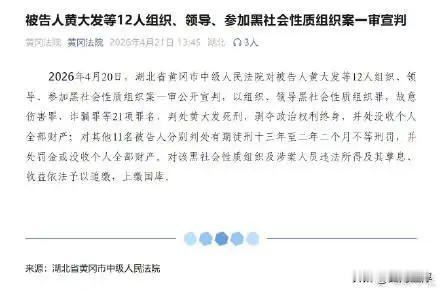 2026年4月20日,湖北省黄冈市中级人民法院的一审判决槌落下,特大黑恶头目黄大发被依法判处死刑,剥夺政治权利终身,没收个人全部财产。