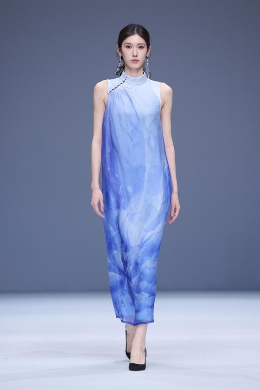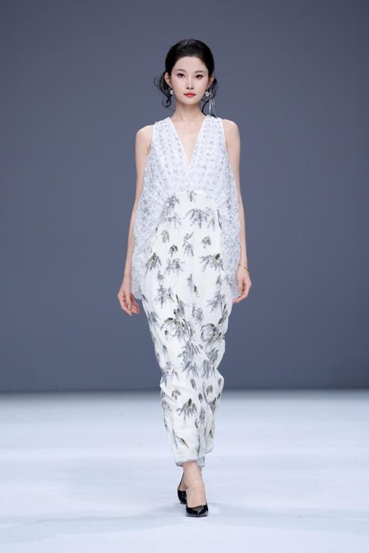 "半山听雨"主题大秀以东方禅意开篇,将雨落、雨盛、雨歇三境化作流动的时装语言。天青、月白、烟灰色调层层晕染,仿佛将江南烟雨穿在了身上。设计师关亚争以简驭繁,用飘逸的廓形勾勒山水轮廓,让每一件衣服都成为承载东方哲思的艺术载体,为喧嚣都市构筑了一方宁静的精神净土。