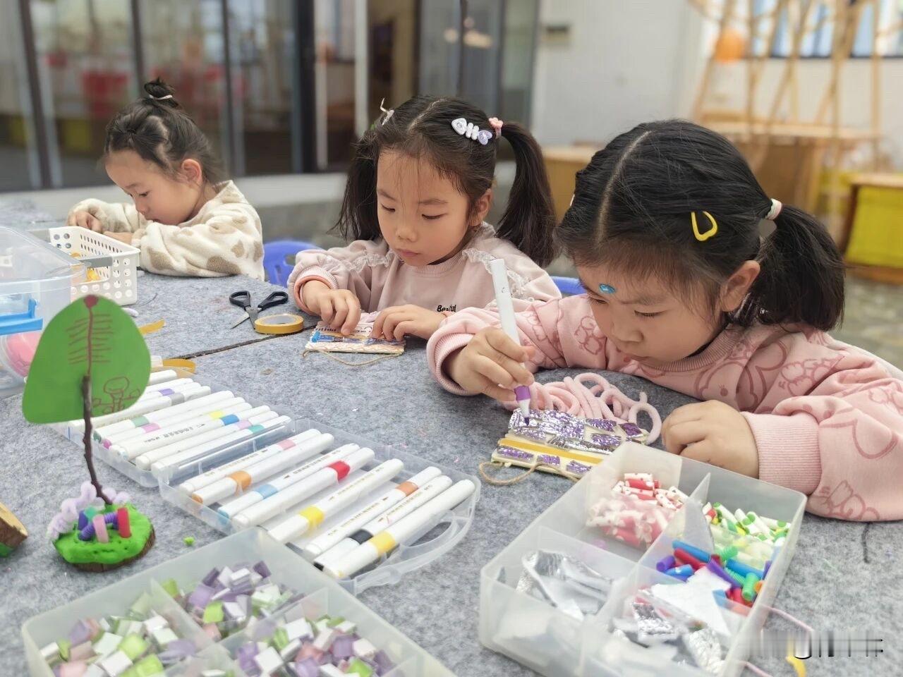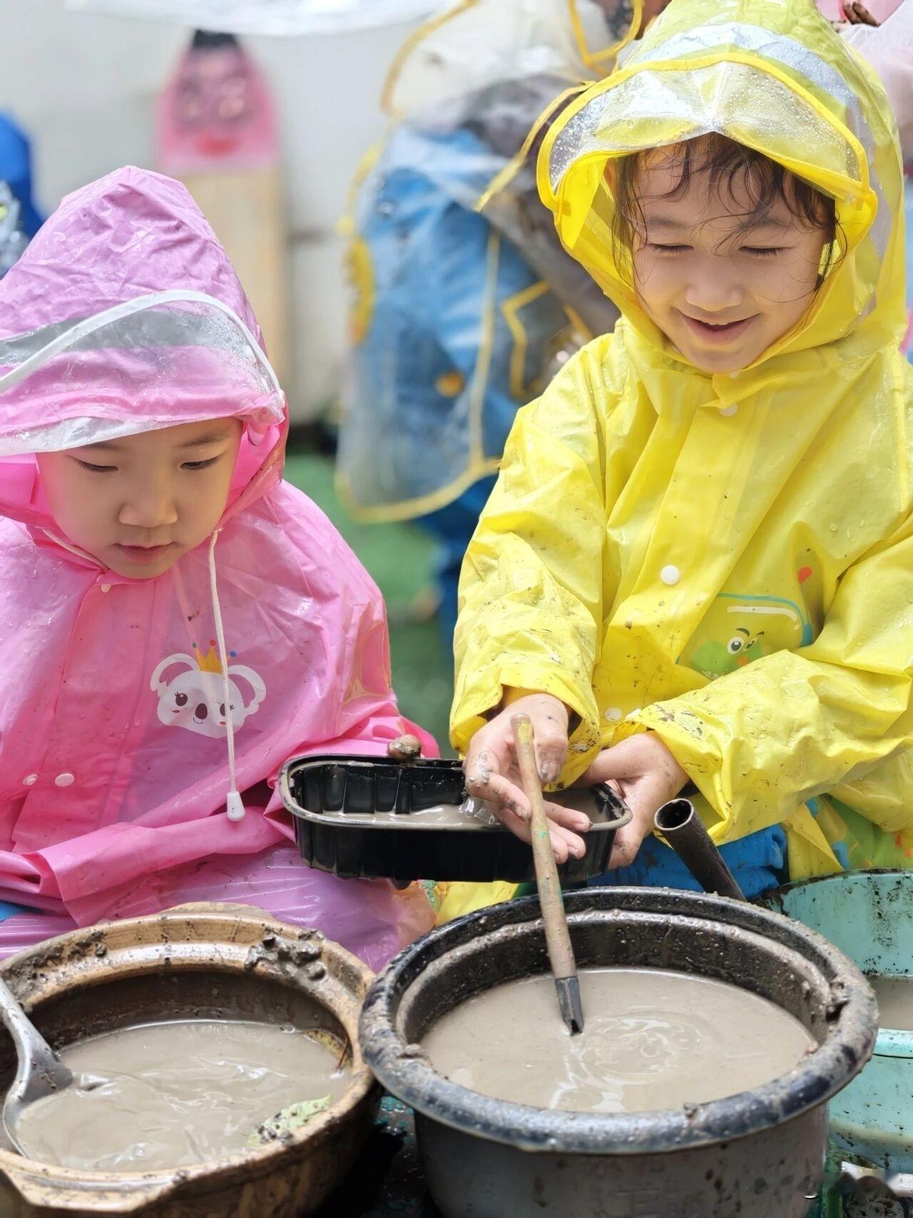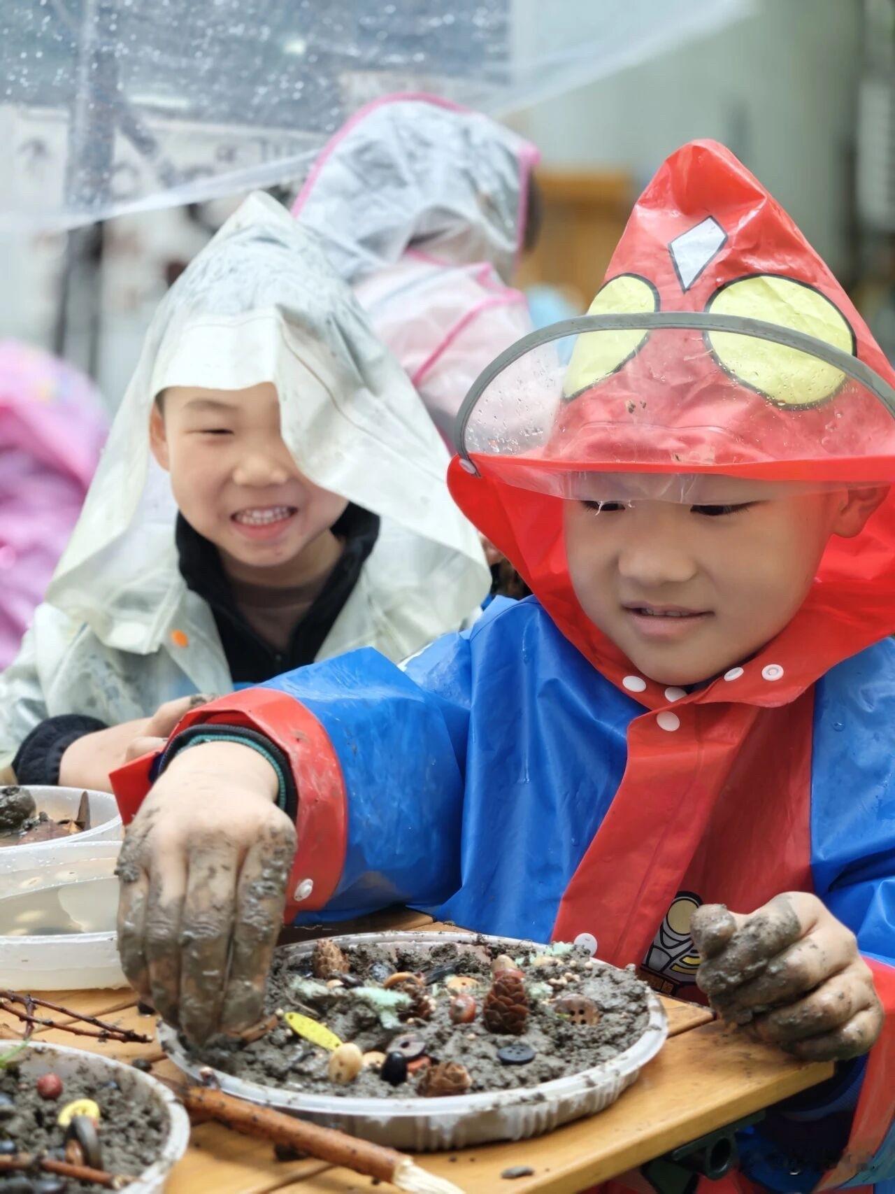 孩子们用锅碗瓢盆当乐器,用吸管、粘土打造魔法森林,自由发挥想象力。户外玩沙玩水、泥巴厨房、多元工坊,大家自主探索、合作游戏。