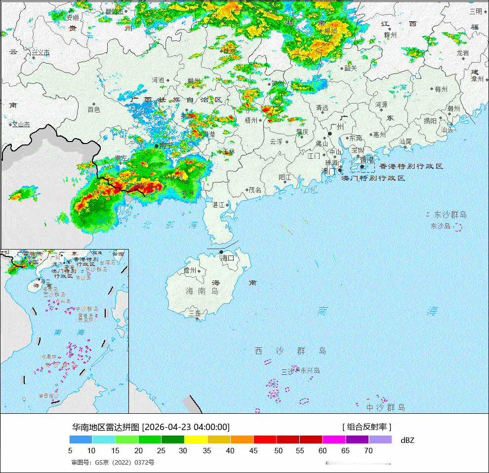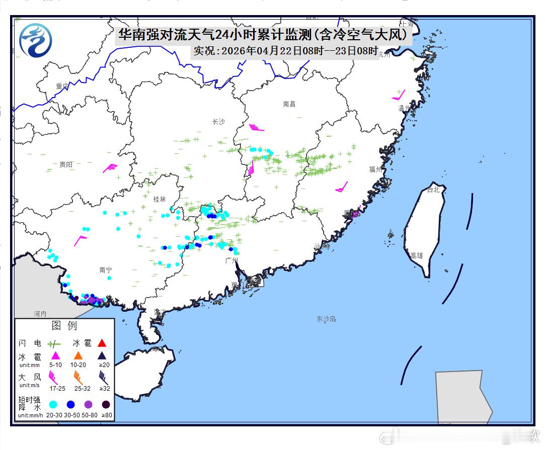 中央气象台今晨继续发布暴雨蓝色预警:预计,4月23日08时至24日08时,广西东南部、广东南部、福建东南部等地部分地区有大到暴雨,其中,广东西南部等地部分地区有大暴雨(100~130毫米)。上述部分地区伴有短时强降水(最大小时降雨量20~40毫米,局地可超过50毫米),局地有雷暴大风等强对流天气。