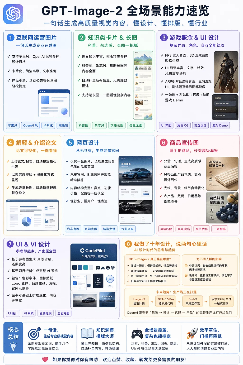 干货满满… GPT Images 2能给大家带来8个领域的应用场景,今天来为大家一一介绍。并且提示词都在文中,可以一键复制。图1 互联网运营图片 图2 知识类卡片 图3 游戏概念 图4 论文信息图图5 网页设计图6 电商详情页图7 UI设计图8 VI设计