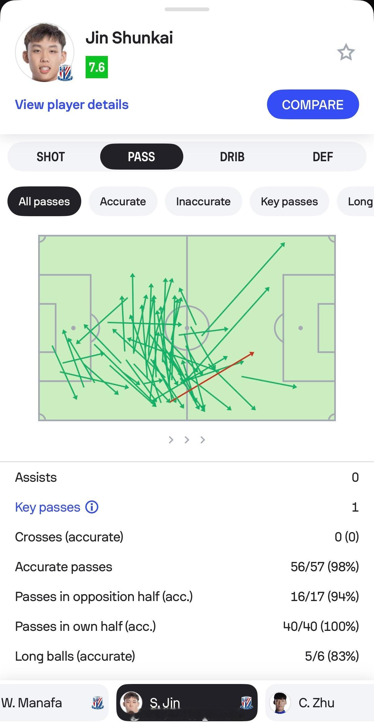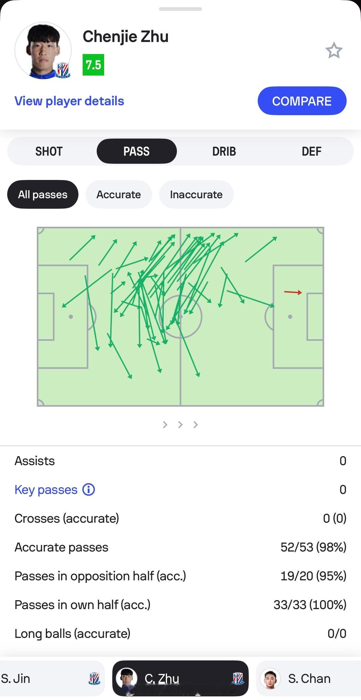 在这样的环境里,朱辰杰-汪海健-金顺凯三人组打出了令人侧目的传球数据:两名中卫全场传球失误加起来一共只有2次,还都是在前场的失误。不管对手逼抢力度如何,这都是很难得完成的数据了——而且我在比赛中看过两次数据,朱辰杰和金顺凯在上半场应该双双都是100%传球成功。汪海健则是完成了大量的横穿、分边和转移,终于让申花的两条边路进攻不再显得孤零零的。