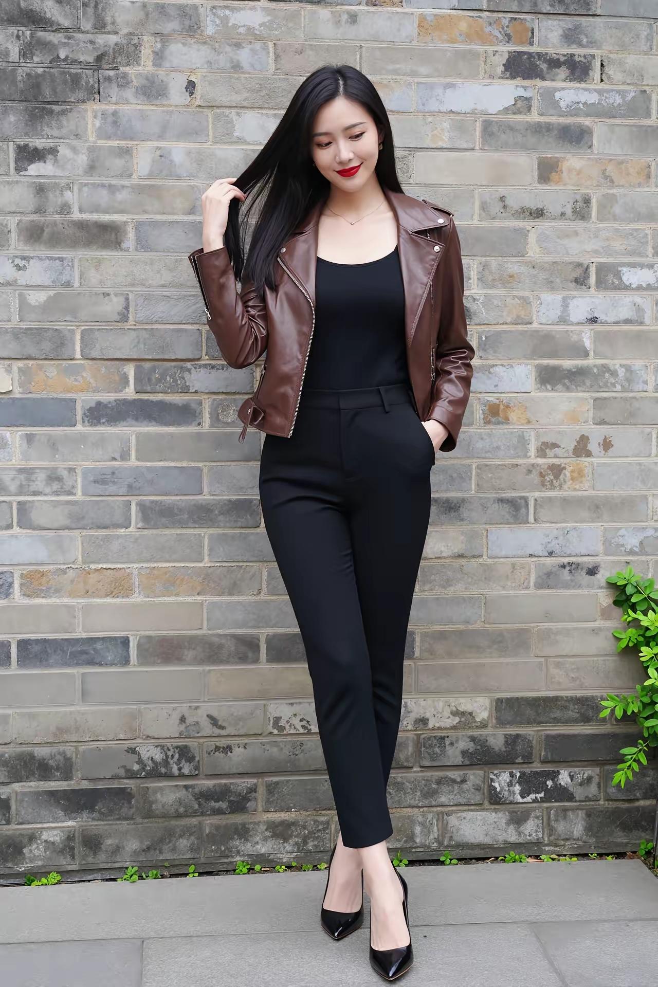 黑色最能彰显年轻和活力,即显身材高挑,又显高贵的气质。酒红色的皮夹克搭配上黑色高