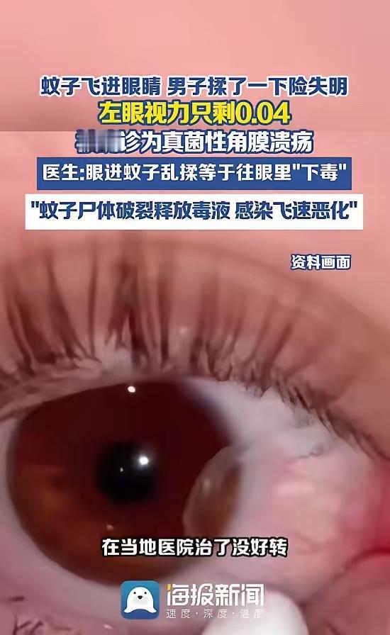 近日,福建,一男子骑车时,一只飞蚊进了他的左眼,他立马揉了揉眼,异物感消失后就没管了,不料没过多久,视力就开始明显下降,他特地赶到武汉治疗,最后确诊了严重真菌性角膜溃疡,差点失明!