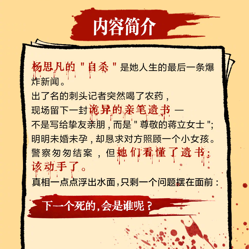 社会新闻记者杨思凡的诡异“自杀”,是她人生的最后一条爆炸新闻。出了名的刺头记者突然喝了农药,现场留下一封诡异的亲笔遗书——不是写给挚友亲朋,而是“尊敬的蒋立女士”。警察匆匆结案,但她们看懂了这封信:该动手了。
