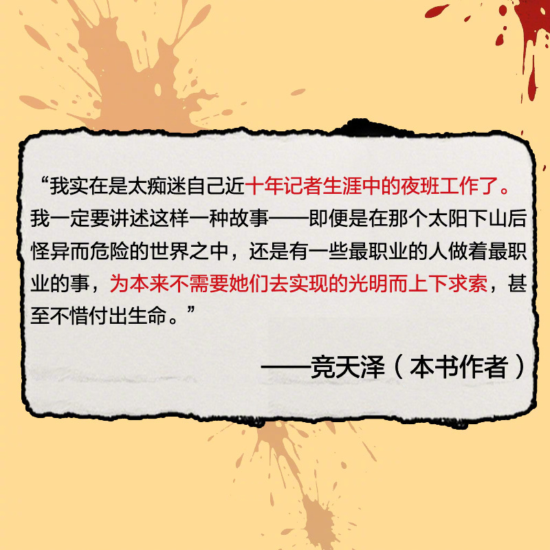 作者是调查记者,见过太多恶人恶事,直言:“我一定要讲述这样一种故事一一即便是在那个太阳下山后怪异而危险的世界之中,还是有一些最职业的人做着最职业的事,为本来不需要她们去实现的光明而上下求索,甚至不惜付出生命。”转发赠书转发赠书转发抽奖新书上市 抽奖详情