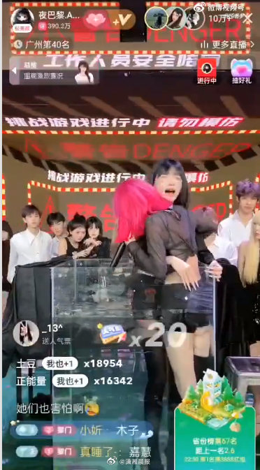 该网友还晒出一段录屏,称“夜巴黎”直播间内曾要求其他主播进入装有鳄鱼的鱼缸并憋气多秒。录屏中,被要求进入鱼缸的主播一直在哭喊,画外音则表示鳄鱼的嘴被封住,“怕啥啊一直叫,水还泼我脸上,有病吧?!又不会咬你,多可爱的动物啊。现在憋气,进去5秒钟!”