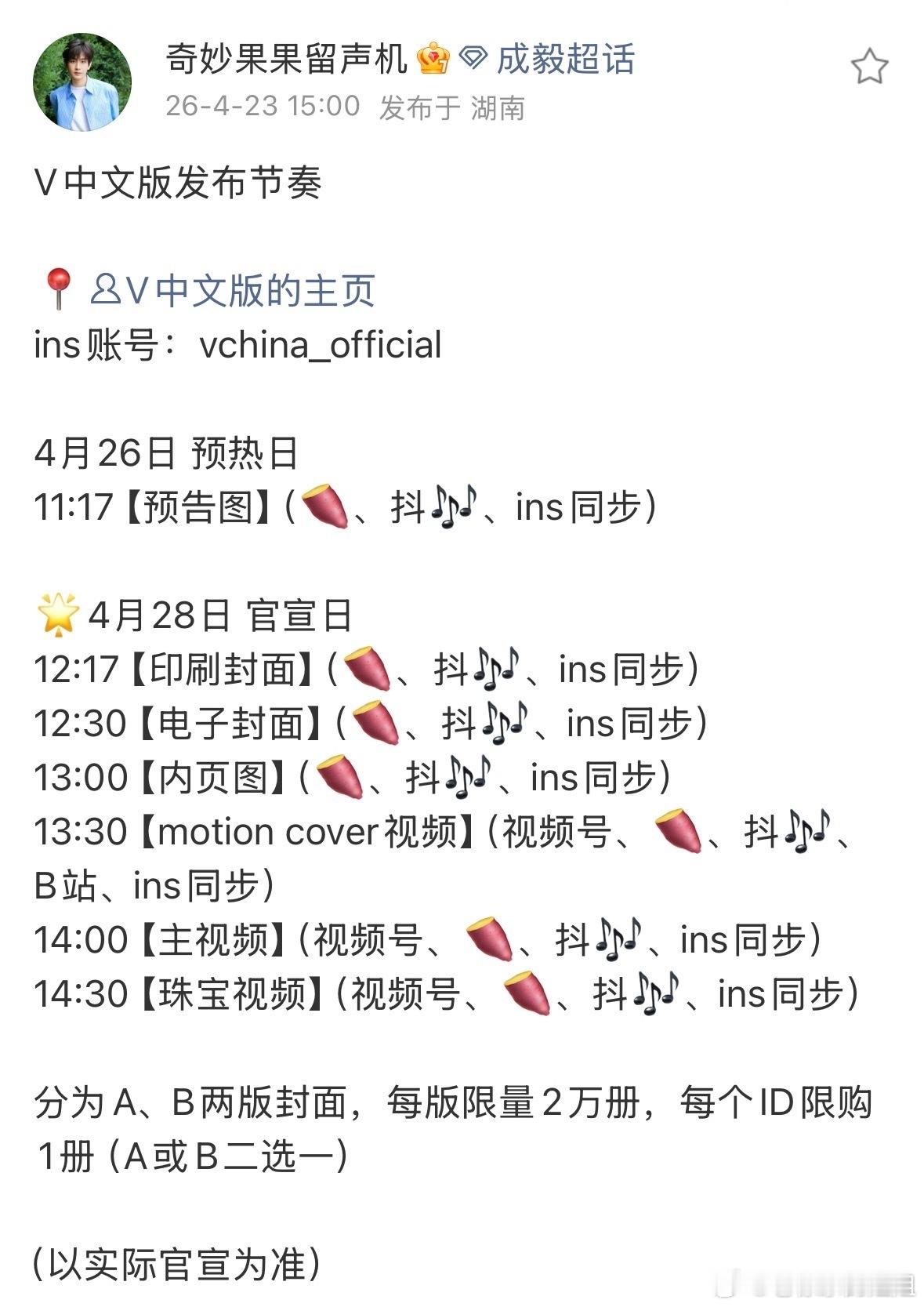 原来温柔从不是嘴上说说,是连杂志都替粉丝考虑周全。这次V中文版,A/B两版各限量2w册,单ID限购一本,只能二选一。嘴上说着“不用为我花钱”,行动上却把每一份偏爱都护得好好的。4月26日预热就位,4月28日拼手速冲!抢好自己的,不囤不炒,用最稳的方式,接住傅诗淇的温柔,护好这份周全! 成毅V中文版发布节奏