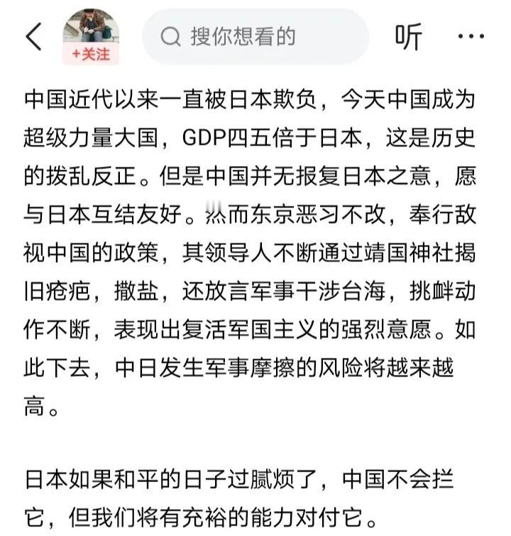 不得不说,胡锡进又在鼓吹中日友好了,老胡反对我们“报复日本”。但我们不是在报复日本,而是在做应该要做的事。