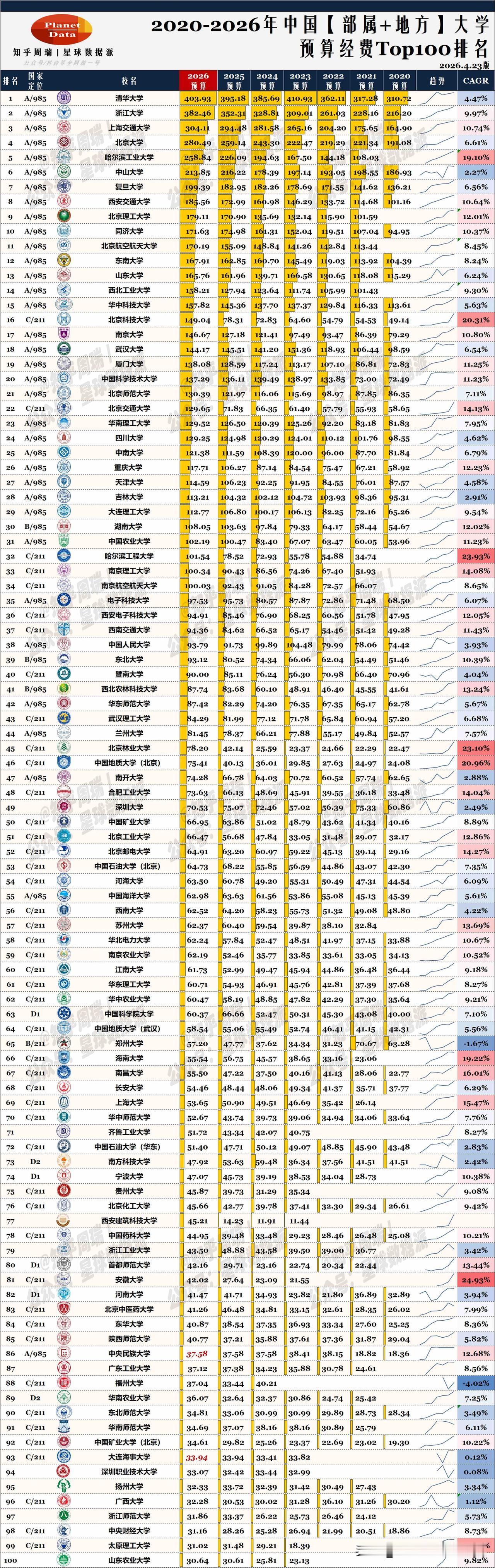 2026部属大学经费:浙大近400亿、北科大149亿超南大武大、西工大涨24%!