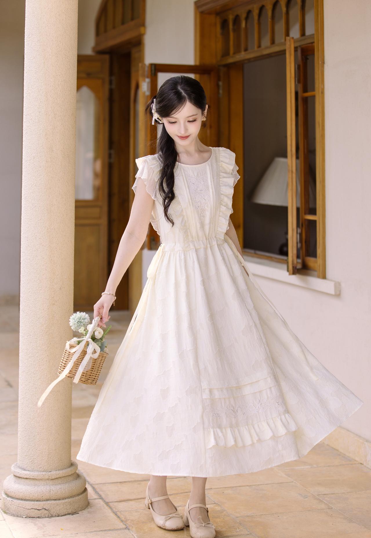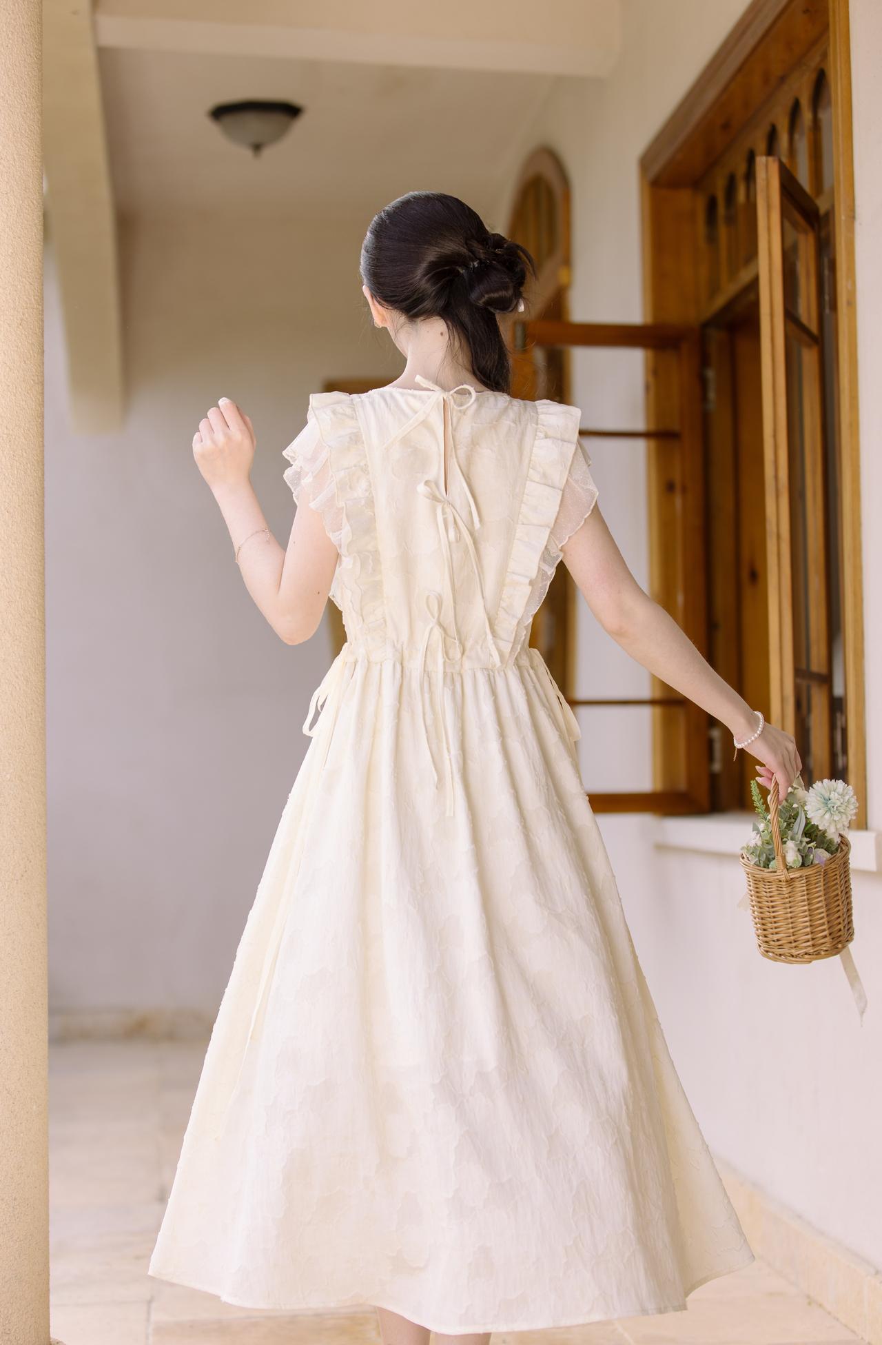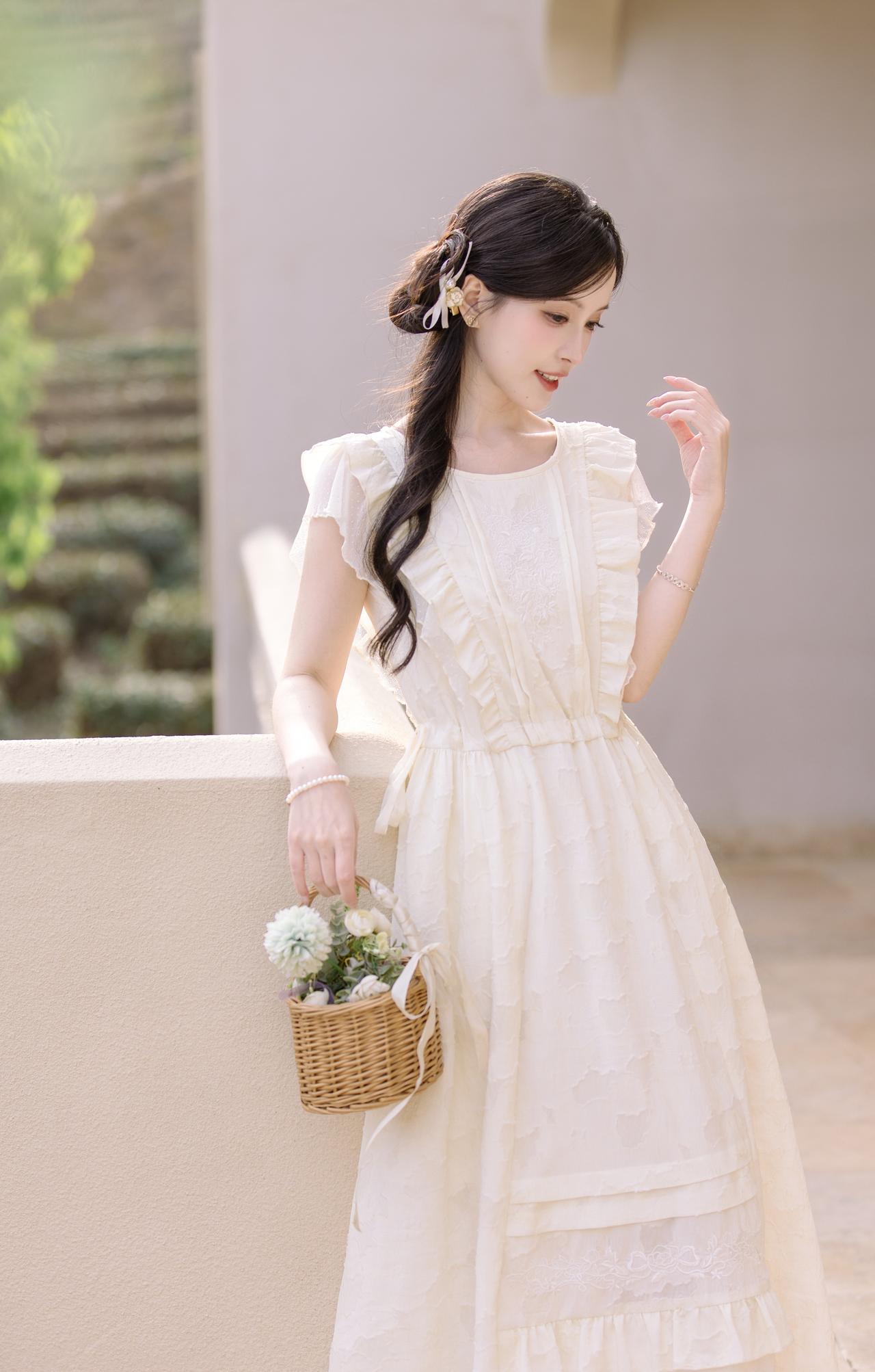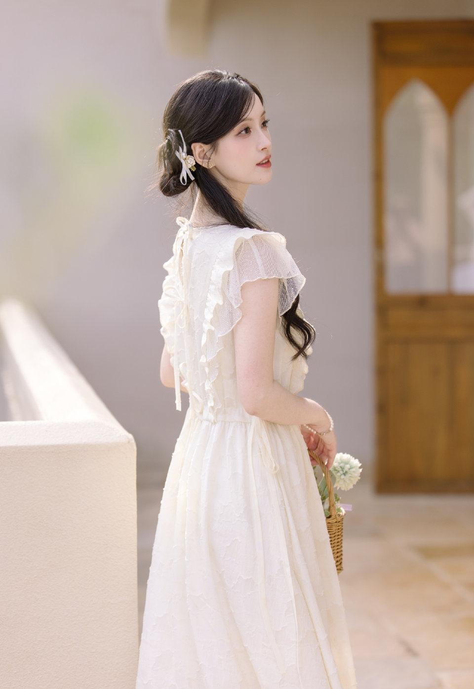 阳光漫过温柔的檐角,奶油白的裙裾缀着细碎蕾丝与荷叶边,轻晃的花篮盛满了春日浪漫。