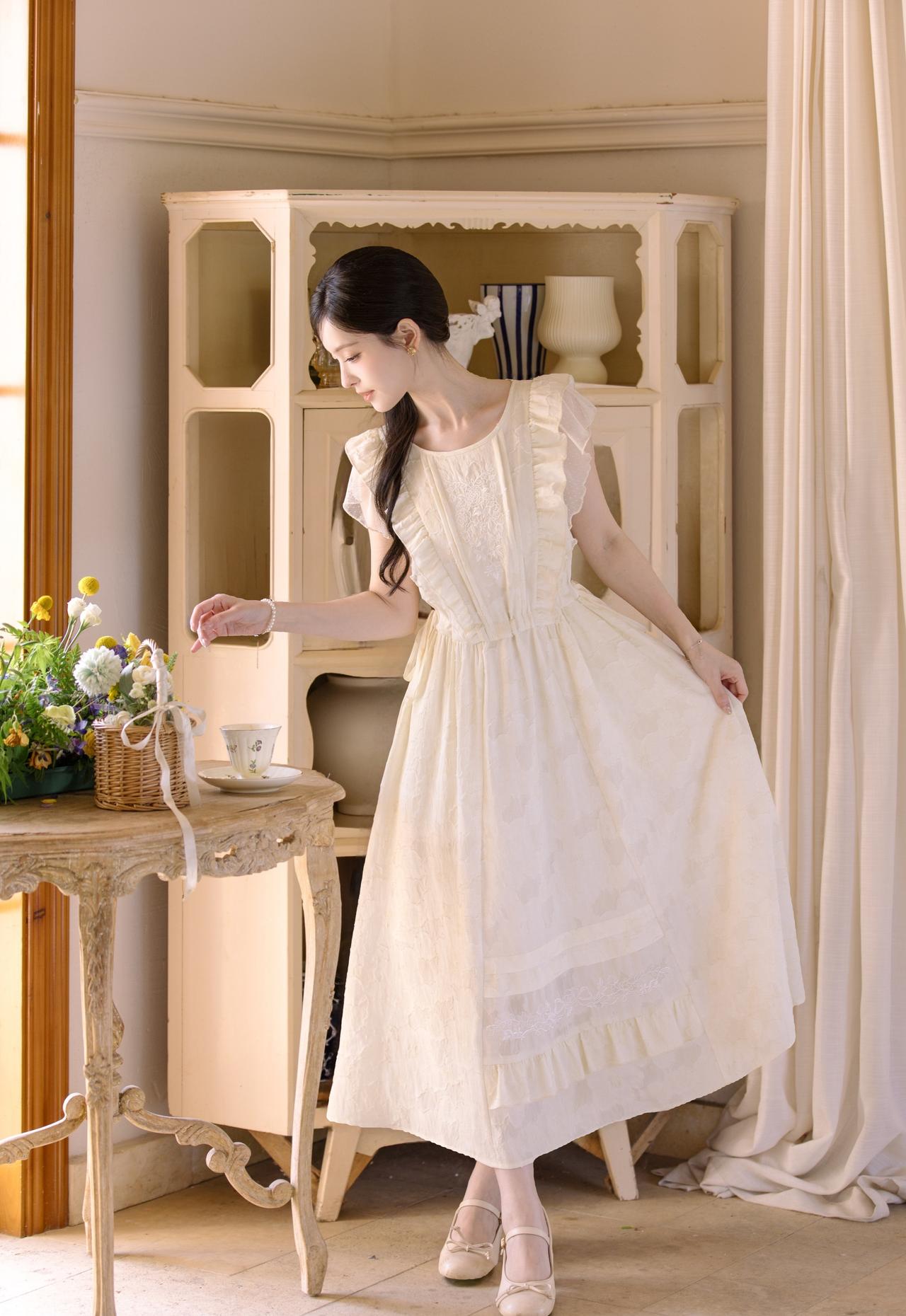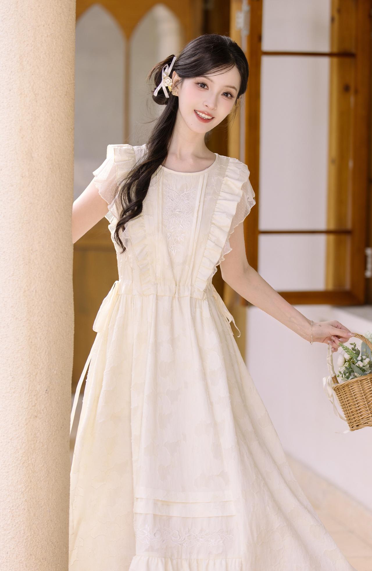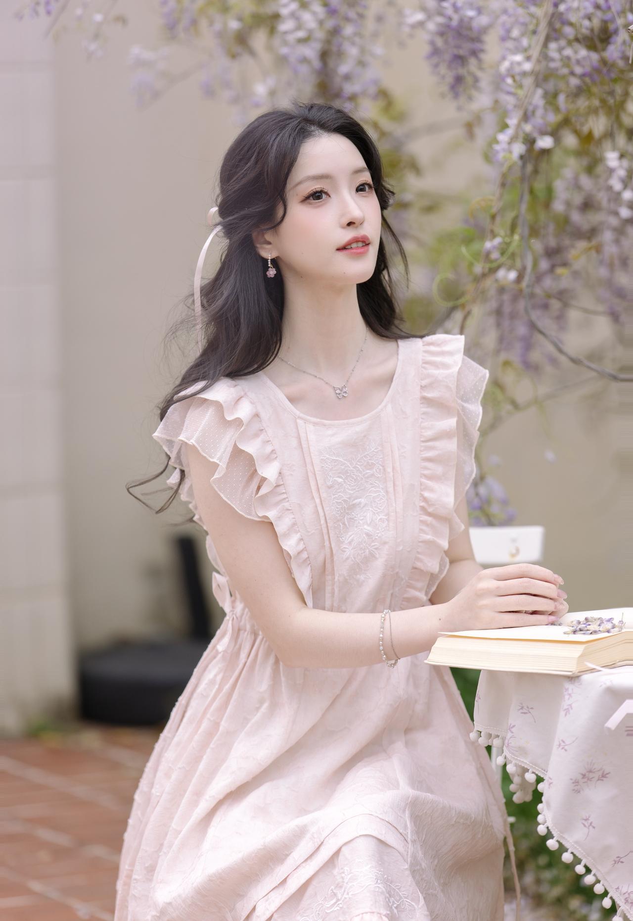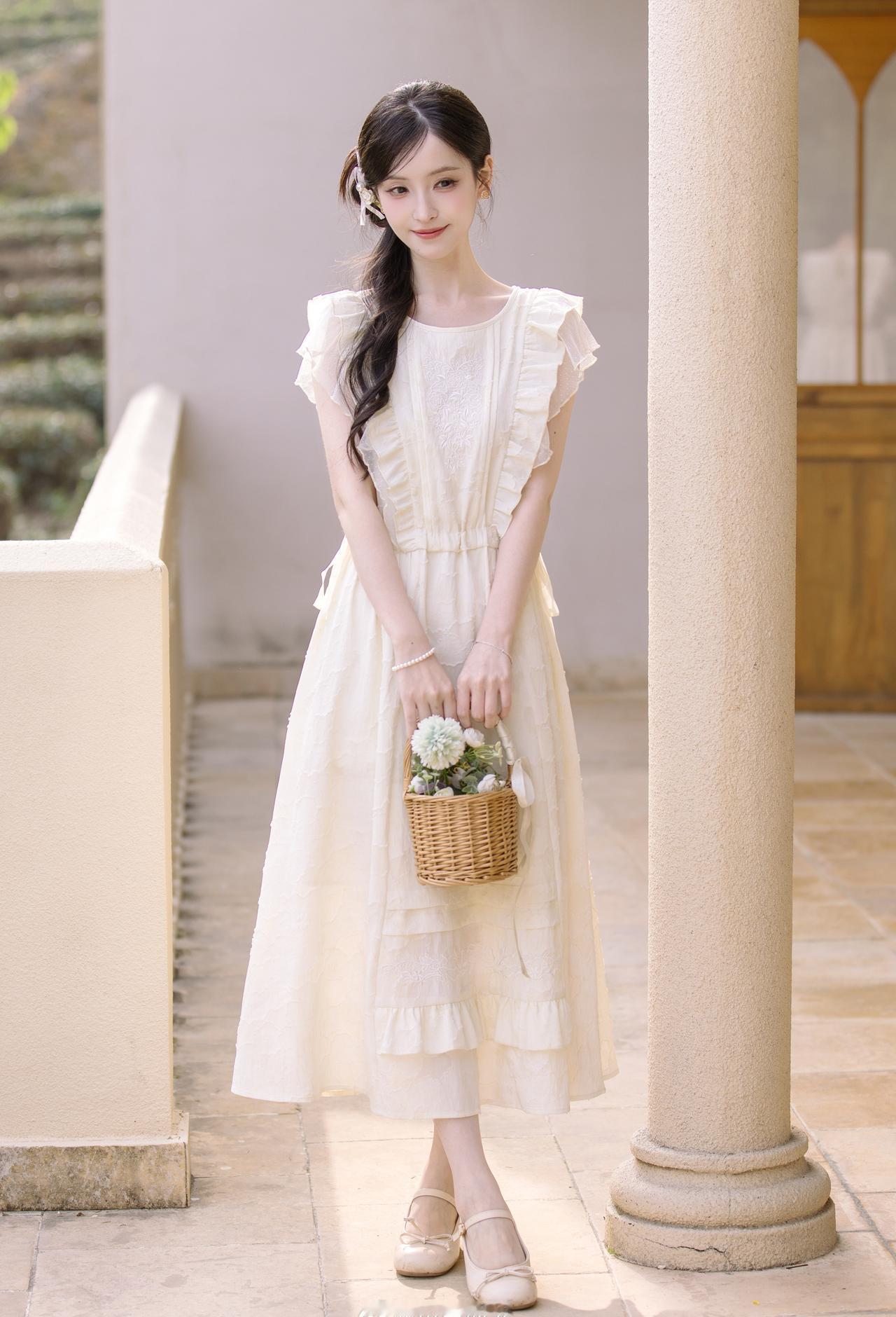 阳光漫过温柔的檐角,奶油白的裙裾缀着细碎蕾丝与荷叶边,轻晃的花篮盛满了春日浪漫。