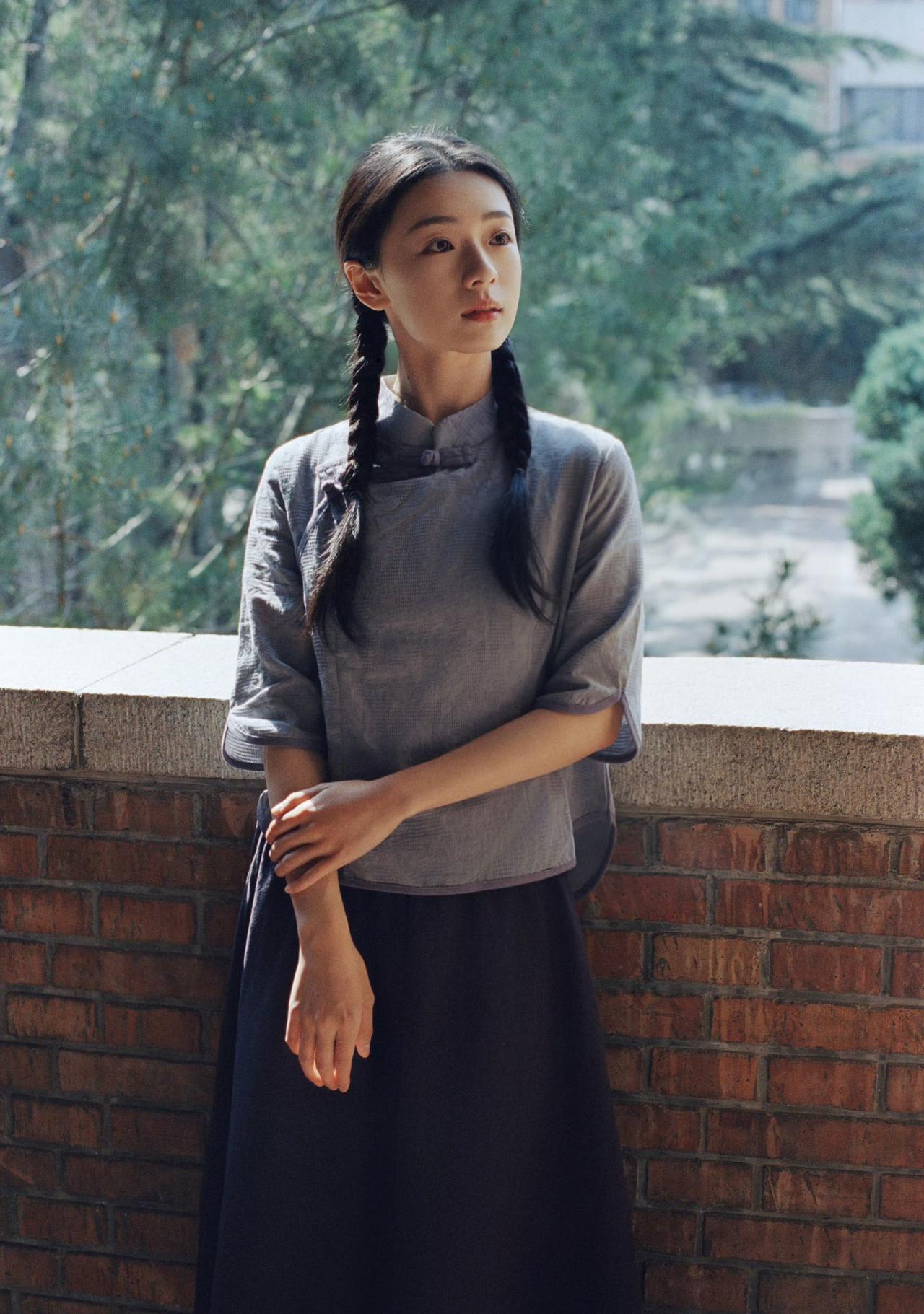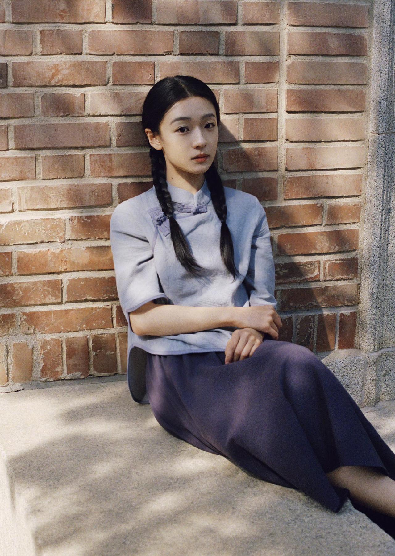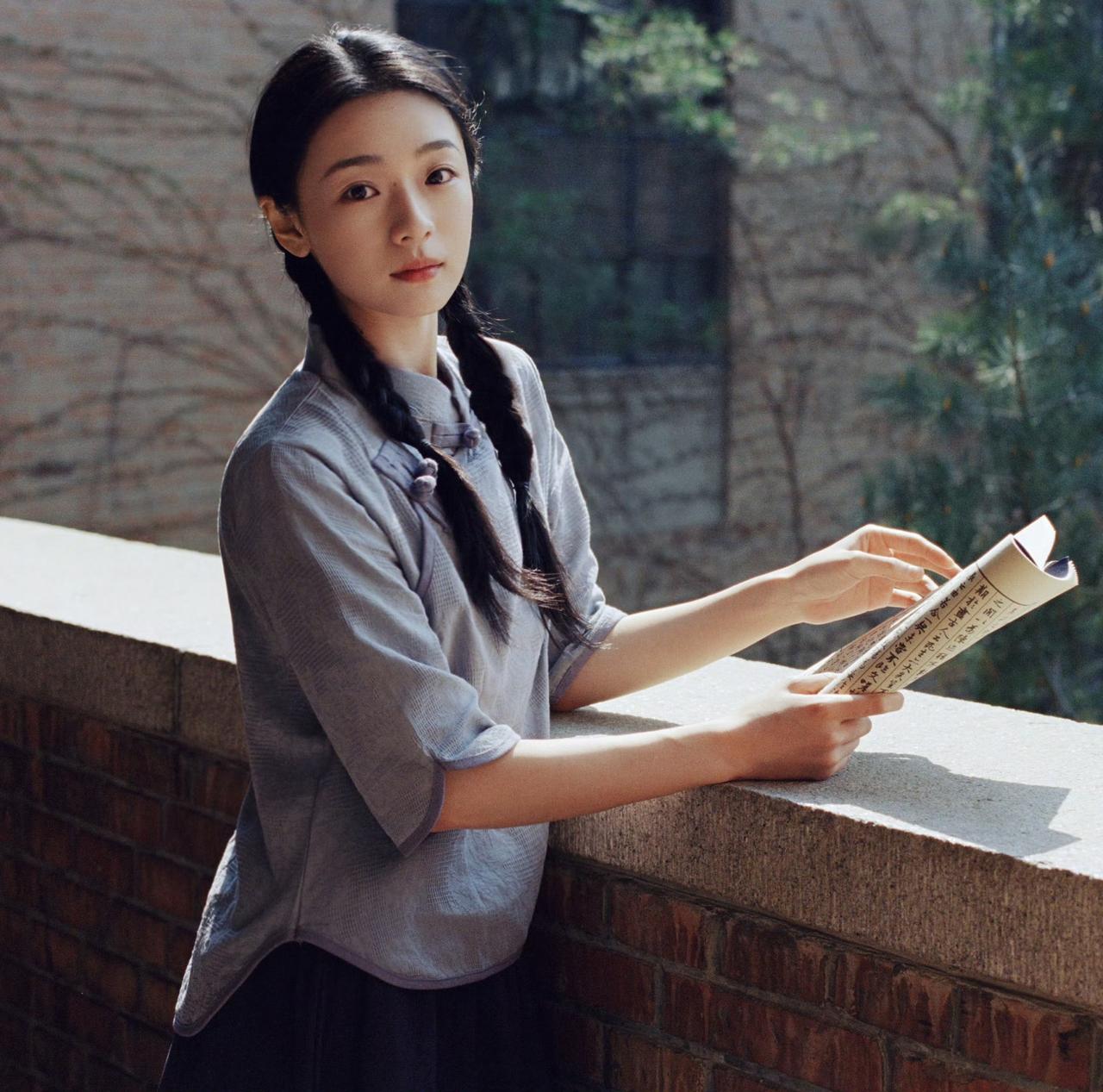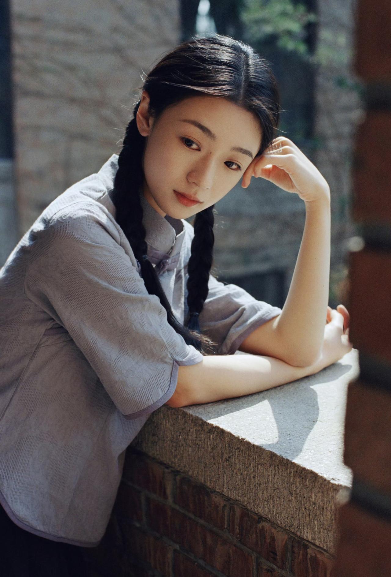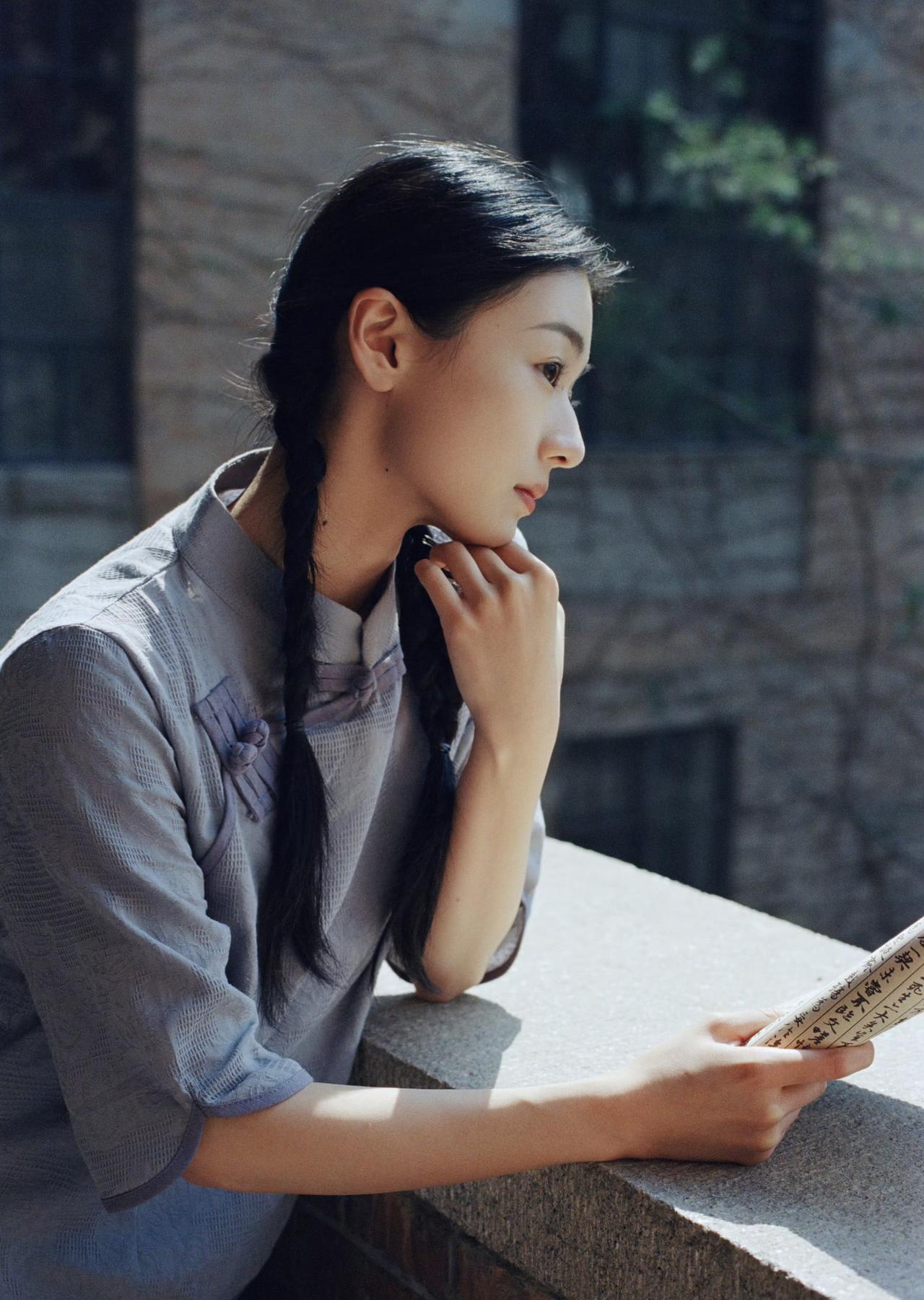 麻花长辫,素色衣衫,青砖墙前日光温柔倾泻。 一纸书卷藏着旧岁心事,一眼清光映着
