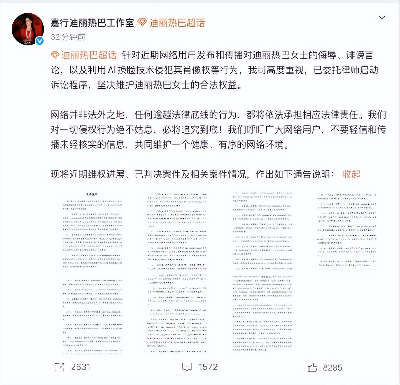 嘉行星光(重庆)影视文化有限公司针对近期网络用户发布和传播对迪丽热巴女士的侮辱、诽谤言论,以及利用AI换脸技术侵犯其肖像权等行为,已委托律师启动诉讼程序,坚决维护迪丽热巴女士的合法权益。