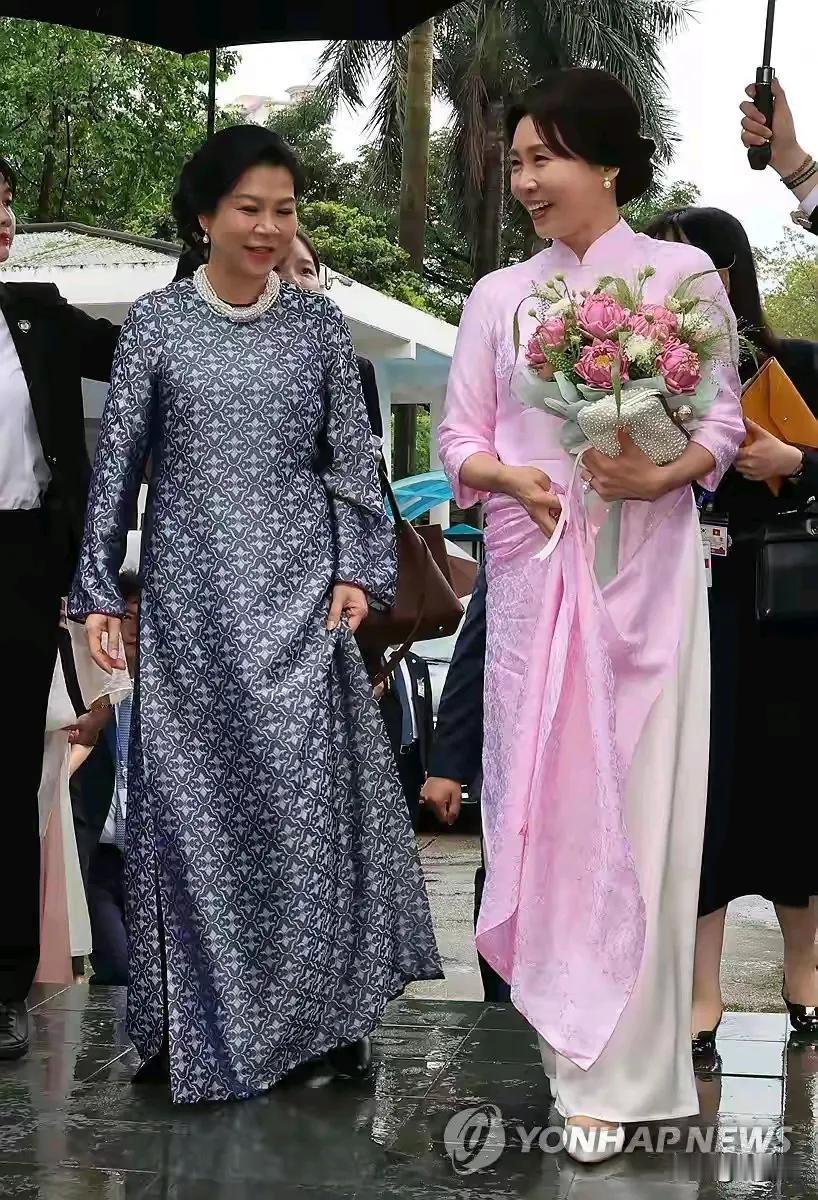 金惠景身穿的是吴氏芳黎赠送的粉色越南传统服饰奥黛长裙,吴氏则身穿藏青色长裙,非常端庄典雅,以花束相迎,并称赞“如越南少女般优雅,温婉贤淑”,两人十分亲切。