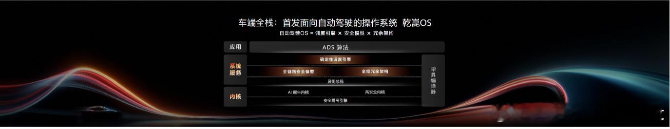 1、行业首个面向自动驾驶的乾崑OS操作系统 ,确定性调度引擎借助灵衢总线等技术,可以降低车内信号30%时延,确保紧急Cut-In等低时延任务能及时执行。全链路安全模型和全维冗余架构,可确保数据的安全与系统的稳定。