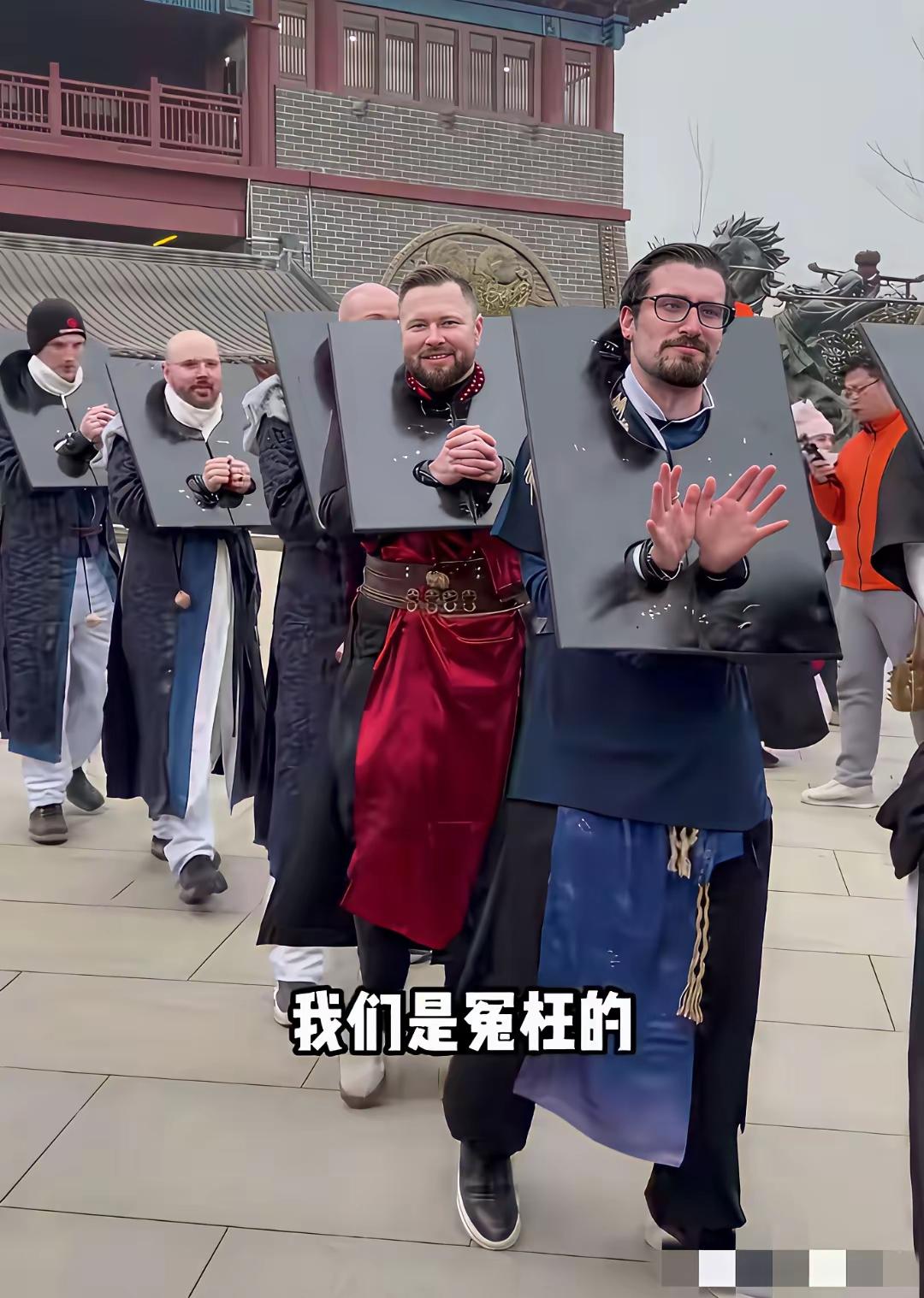 不同的文化造就不同的认知,不管这个东西是什么,对于人家没见过,没用过的人来说,就是一个好玩的东西而已,一帮子老外排着队,戴着枷锁,一个比一个高兴,要是让中国人戴着这个拍照,估计只要是个正常人就不同意,大部分人肯定感觉戴这个不吉利吧!