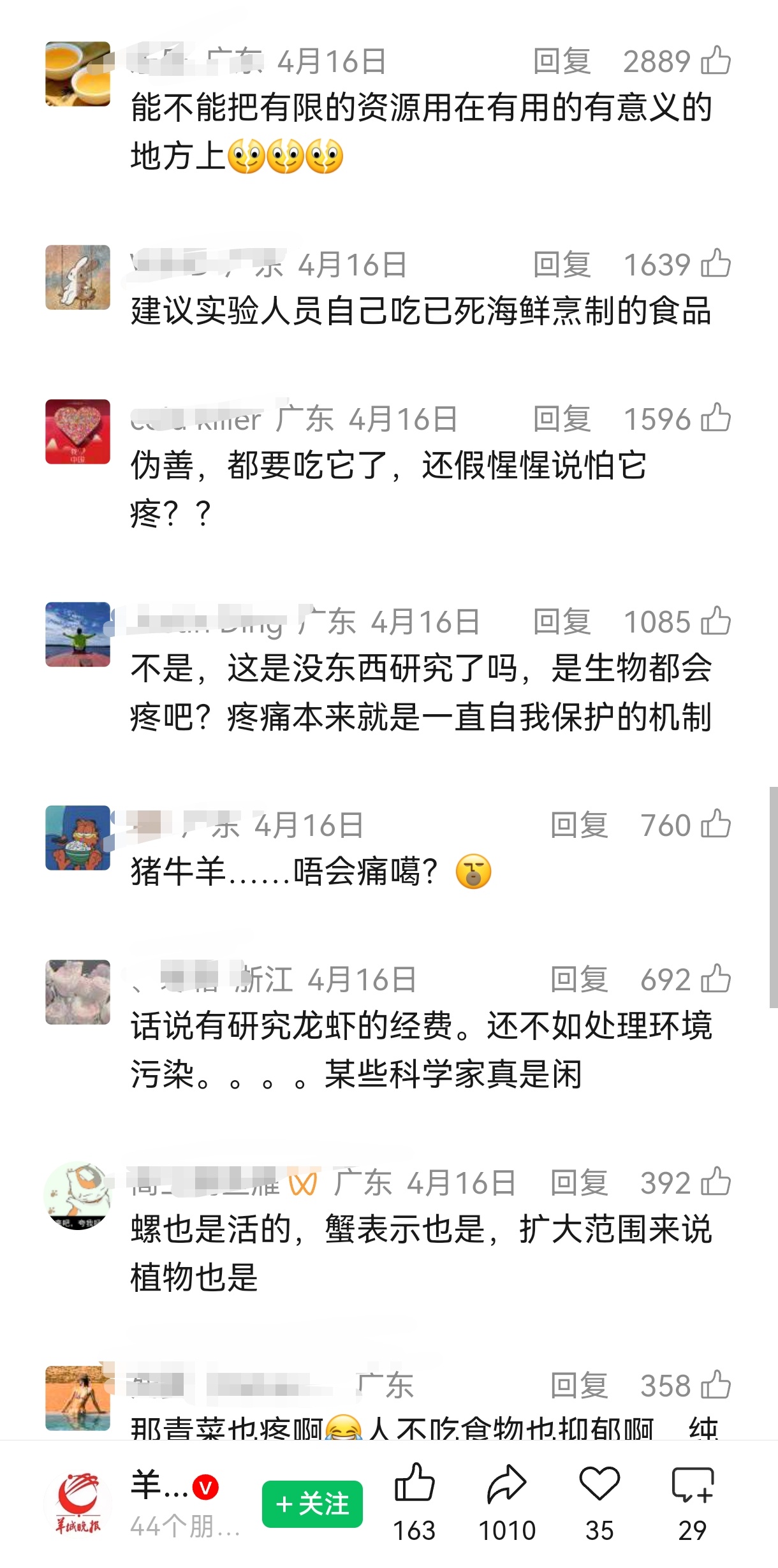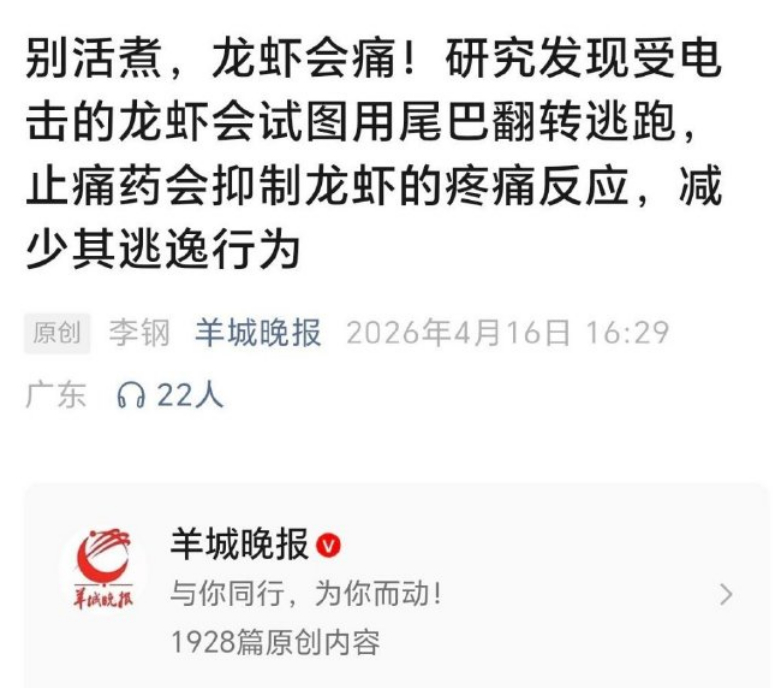 羊城晚报一篇呼吁重视龙虾疼痛的文章最近很火,被认为是过度在乎所谓动物权益了,结合去年有篇更著名更回旋镖的《妻子疯狂打赏是婚姻的求救信号》神文,也出自羊城晚报,看来传统媒体还是懂流量密码的。