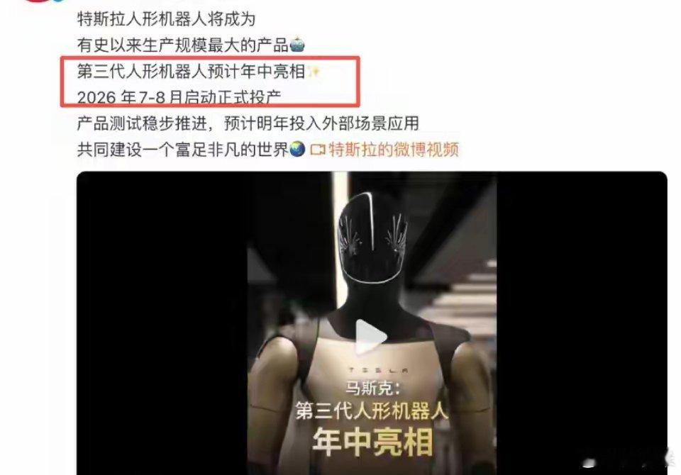 刚刚,深夜大利好,5万亿!人形机器人,要继续主升浪?(附股)就在今晚,人形机器人板块有一个消息,引发市场广泛关注。那就是特斯拉正式披露其第三代人形机器人(Optimus Gen3)的清晰路线图,产品将于年中亮相,并于2026年7-8月正式启动投产从特斯拉公开的消息来看,明年起将投入外部场景应用。另外今天,特斯拉在2026年第一季度财报中进一步确认,为首个大规模Optimus工厂所做的准备工作将于第二季度初启动。这座位于弗里蒙特的工厂,将把原Model S/X产线改造为年产能100万台的第一代机器人生产线。更令人瞩目的是,其位于得克萨斯的超级工厂已被规划为第二代产线基地,长期设计年产能高达1000万台。这一系列规划,有望缓解市场此前对行业量产落地的顾虑,行业或将逐步迈入量产推进、成本优化的发展阶段。在此背景下,或许值得我们持续做产业链跟踪。过去市场对人形机器人的疑虑可能在于“何时能真正量产”。而特斯拉此次不仅给出了明确的时间表,更通过产线改造、工厂规划等实际行动,将量产从“愿景”转化为“工程任务”。这不仅是对自身技术路线的确认,也将为全球产业链发展带来积极参考与行业指引。与此同时,国内进展同样迅速,广东佛山已启用首条万台级人形机器人自动化产线,实现30分钟下线一台整机。这意味着,无论在国际还是国内,人形机器人或已具备初步的规模化制造能力。头部企业的率先行动,有望加速形成“示范效应+供应链聚集”的正向循环。如果说强大的制造能力是人形机器人的“骨骼”与“肌肉”,那么人工智能就是其“大脑”与“灵魂”。近年来,AI具身智能(Embodied AI)、视觉-语言-动作大模型(VLA)以及强化学习的突破性进展,赋予了机器人前所未有的环境感知、任务理解与自主决策能力。这种能力上的质变,使人形机器人不再局限于预设程序的重复劳动,而是能够像人类一样,在开放、动态的物理世界中灵活适应、泛化执行复杂任务。从特斯拉Optimus通过观察学习新技能,到国内厂商机器人30分钟即可下线一台,技术与制造的双重飞轮效应正在加速形成,为未来向商业服务、家庭陪伴等更广阔场景渗透奠定了坚实基础。从资本市场视角看,人形机器人板块在经历年初的深度调整后,当前估值已回归至历史低位区间,交易量与换手率等指标也处于底部区域。前期因过度乐观预期而产生的估值泡沫或已被充分挤出,板块定价回归相对理性,前期偏高的市场预期已得到充分消化。展望未来,特斯拉本次披露的量产规划,将成为行业发展进程的重要事件节点。随着弗里蒙特工厂的改造启动和得州超级工厂的规划落地,市场关注点将从“是否能造出来”转向“订单能否落地”和“成本能否控制”。因此或可以跟踪:1、灵动手等核心供应链当前,全球科技巨头正围绕“具身智能”构建开放生态:特斯拉推出Dojo超算+VLA模型闭环,英伟达发布Isaac GR00T平台,国内企业也在推进ROS 2兼容的机器人中间件和仿真训练系统。即那些已进入全球头部企业供应链、具备量产交付能力和显著成本优势的核心零部件公司有望收益。2、有实质性应用场景落地人形机器人的大规模应用,不仅依赖硬件制造,更需要操作系统、AI模型、开发工具链和应用场景生态的协同演进。整机或解决方案提供商,它们将率先受益于行业从“0到1”的商业化突破。综上所述,在特斯拉官宣量产计划驱动下,人形机器人产业正逐步走出技术验证阶段,量产化进程有望稳步推进。特别声明:以上内容绝不构成任何投资建议、引导或承诺,仅供学术研讨。如果觉得资料有用,希望各位能够多多支持,您一次点赞、一次转发、随手分享,都是笔者坚持的动力~人工智能机器人人工智能机器人机器人