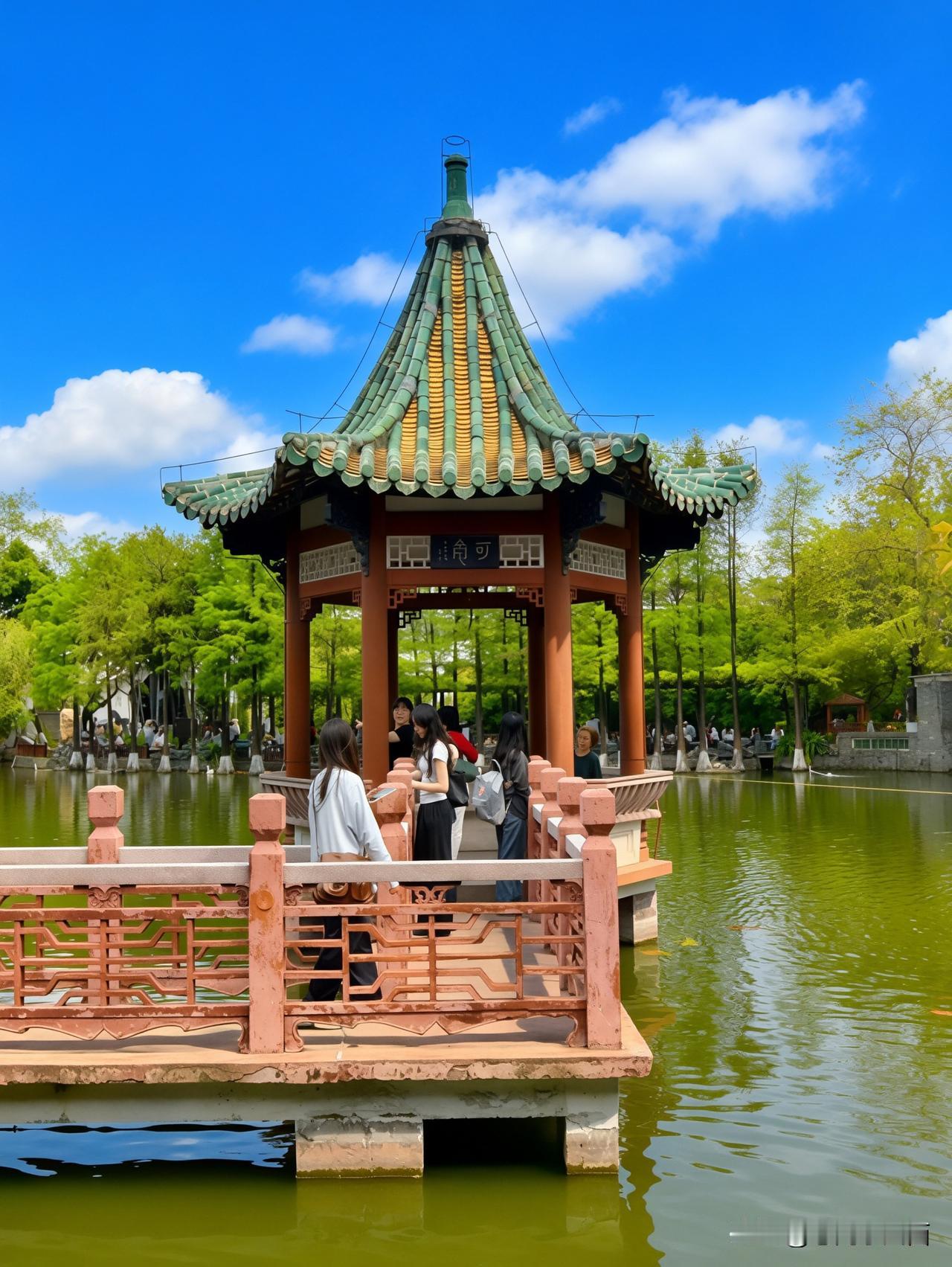 环碧廊如青带蜿蜒,雕花漏窗滤过细碎光影,将亭台碧水裁成流动画卷;邀山阁飞檐翘角,凭栏可揽全园错落景致,红柱琉璃亭映于碧波之上,锦鲤悠游,尽显岭南园林“小中见大”的精妙。