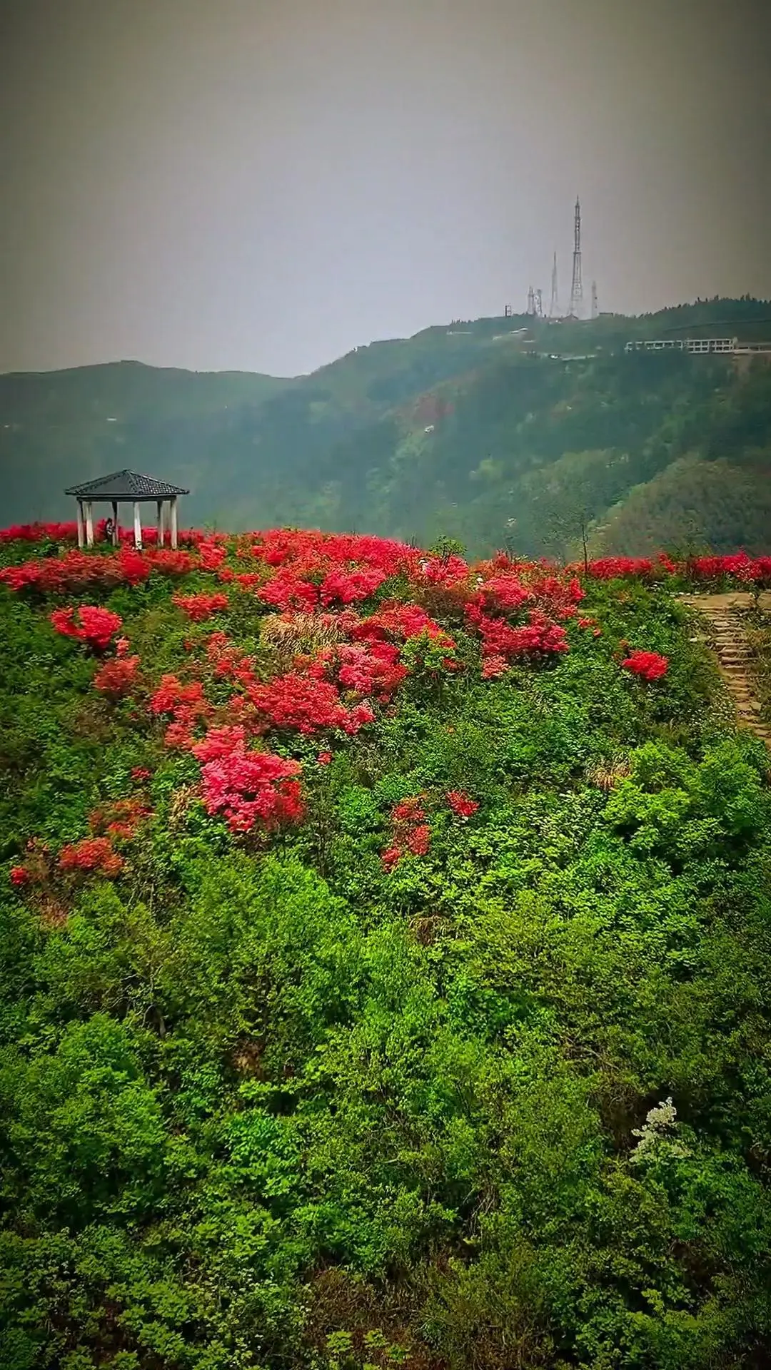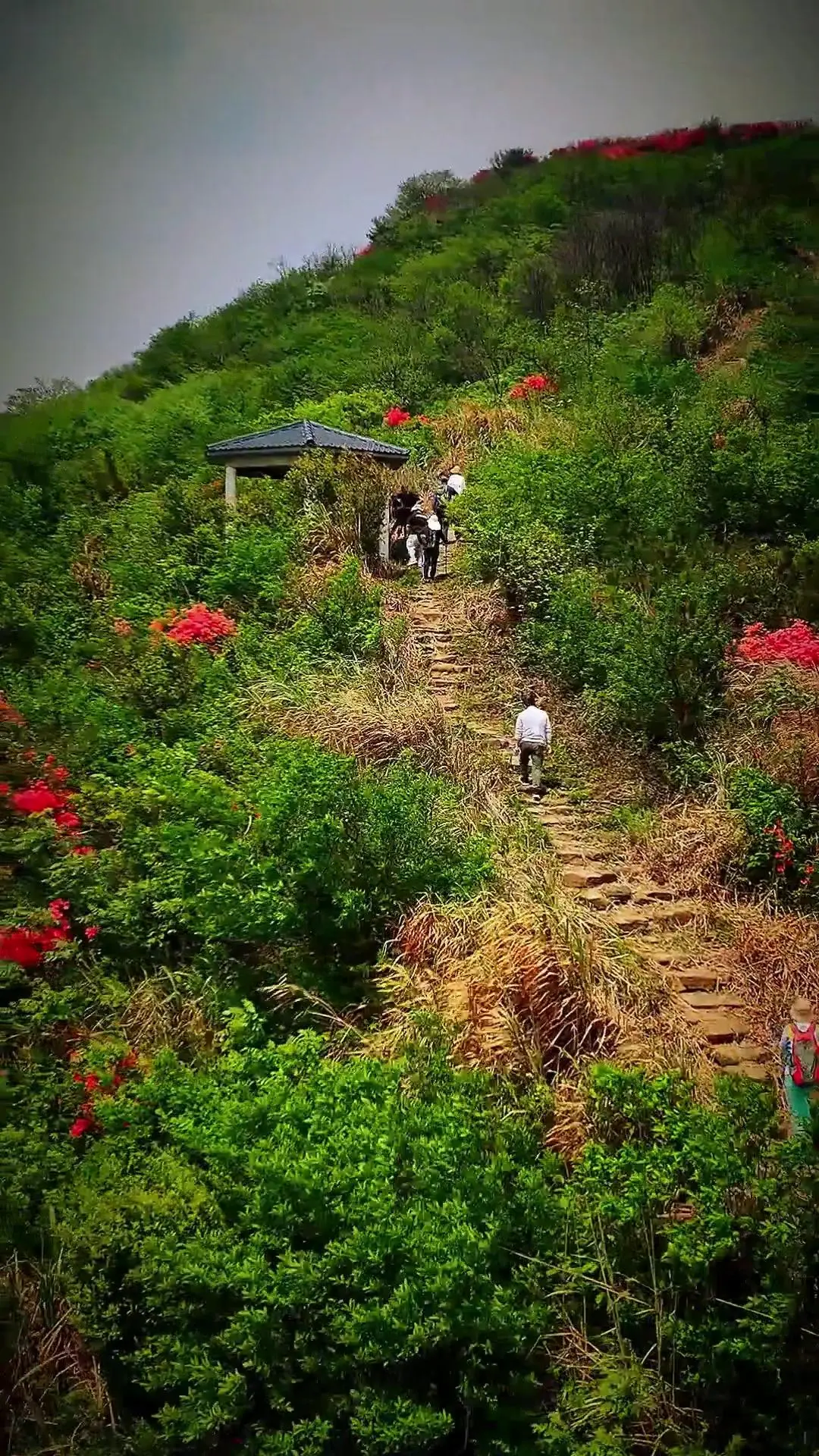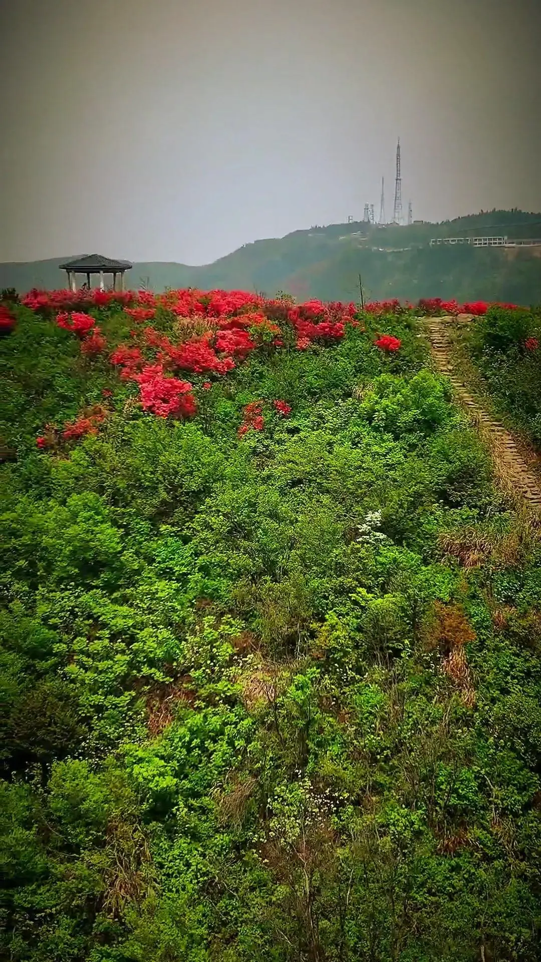 沿着山路慢慢走,从零星几朵到成片艳红,越往上越惊喜。山顶的视野超绝,漫山遍野的杜鹃开得肆意,像是把春天揉碎了撒在山坡上,连风里都飘着花香~🌸