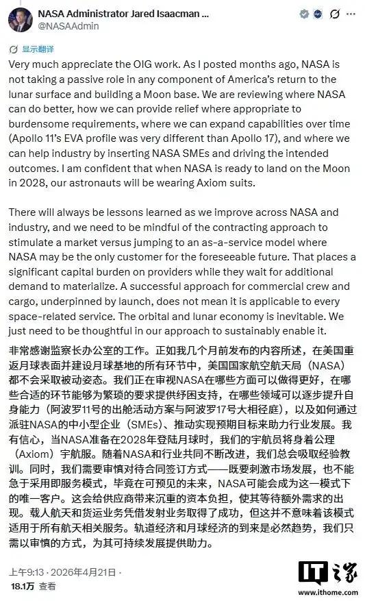 即便如此,NASA现任局长艾萨克曼依旧宣称充满信心,让宇航员们在2028年穿着这款新型宇航服登月。据称,NASA正在尽量删减那些冗余、繁琐的技术指标,从而给研发者降低难度,从而实现更早的交付。