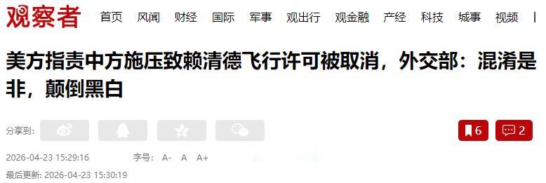 4 月 23 日,外交部例行新闻发布会,彭博社记者提了个问题,说 22 日美国国务院指责中国向三个非洲国家施压,让他们取消了台湾地区领导人赖清德的飞行许可,想知道中方怎么看。