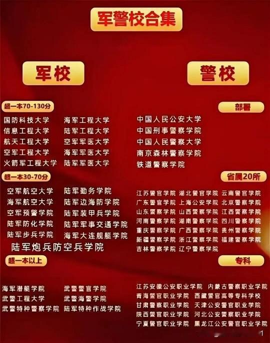 - 批次顺序:军校和警校都在提前批,不冲突可兼报。若提前批滑档,不影响后面普通一本的录取。建议“冲军校、稳警校、保普通一本”。