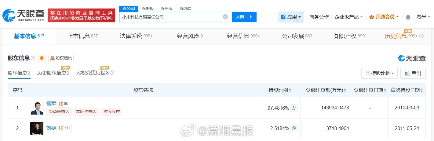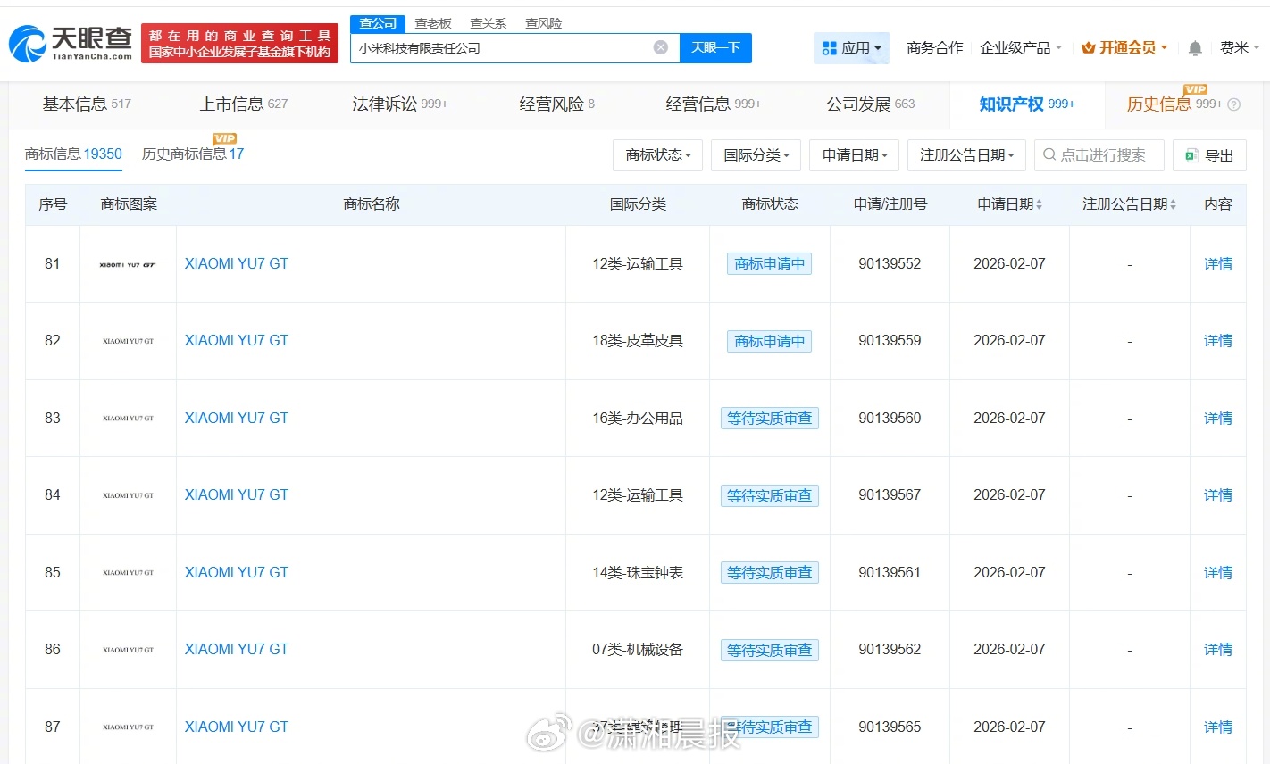【#小米今年已申请YU7 GT商标#, #小米近期申请YU7 GT商标#】#YU7GT5月底发布# 据媒体报道,4月24日,在2026(第十九届)北京国际汽车展览会上,小米集团创始人、董事长兼CEO雷军表示,YU7 GT将于5月底发布,定位长途旅行的跑车级SUV,高性能、豪华舒适、长续航。记者查询天眼查发现,今年2月,小米科技有限责任公司申请注册多枚“XIAOMI YU7 GT”商标,国际分类包括运输工具、珠宝钟表等,当前商标状态均为等待实质审查。小米科技有限责任公司成立于2010年3月,法定代表人为雷军,注册资本约14.8亿人民币,经营范围包括通讯设备销售、厨具卫具及日用杂品批发、厨具卫具及日用杂品零售等,由雷军、刘德共同持股。
