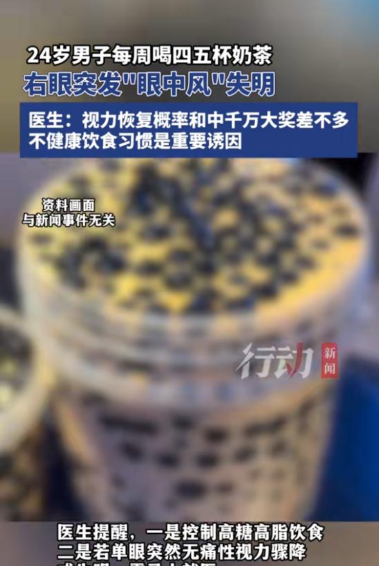 信息来源:《24岁男子每周喝四五杯奶茶,右眼突发“眼中风“失明,医生:视力恢复概率和中千万大奖差不多,不健康饮食习惯是重要诱因》行动新闻