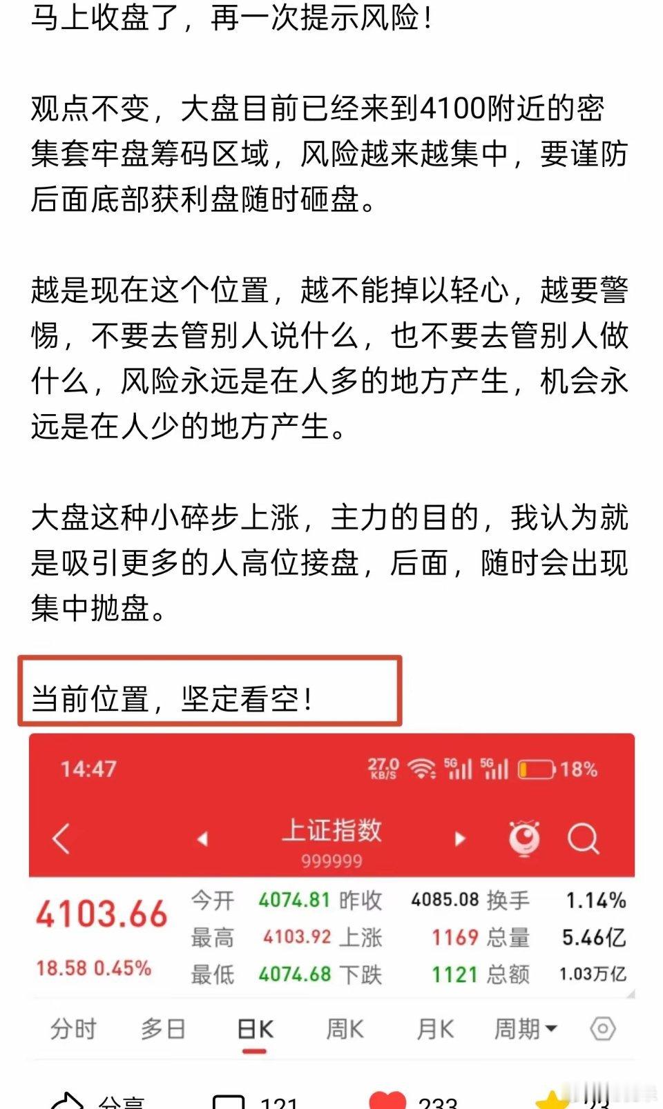 A股,今日缩量下跌,风险总是在所有人不认可的时候产生!这段时间一直在提示风险,有风险意识的人,应该很早就规避了,没有风险意识的人,那就只能让市场给出答案了。市场永远不会错,错的只有我们自己,做交易,风控永远是第一位,其次再去博弈利润。如果一个人眼里一点风险都无惧,那最后就会伤痕累累。昨天高位放量,本身大概率就是标志着顶部或阶段顶部,不要侥幸,不要博弈小概率事件,说实话,有时候侥幸一次,前期所有的努力,全部白费。观点不变,点位不到,就看戏!点位到了,知行合一。股票a股
