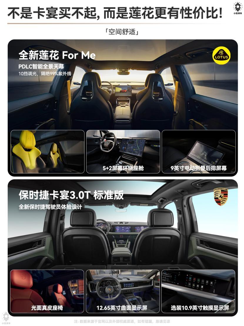 总结来说:卡宴 3.0T 是燃油时代经典,Turbo GT 是燃油性能巅峰。而后起之秀莲花For Me,完美诠释了全能不妥协。以电气化优势破局,用更亲民的价格,带来旗舰级性能表现,同时兼顾空间、舒适与油耗。不必为了速度牺牲家用,主驾尽兴、后排安心,真正做到兼顾性能与实用,这才是新时代全能性能SUV的标准答案。