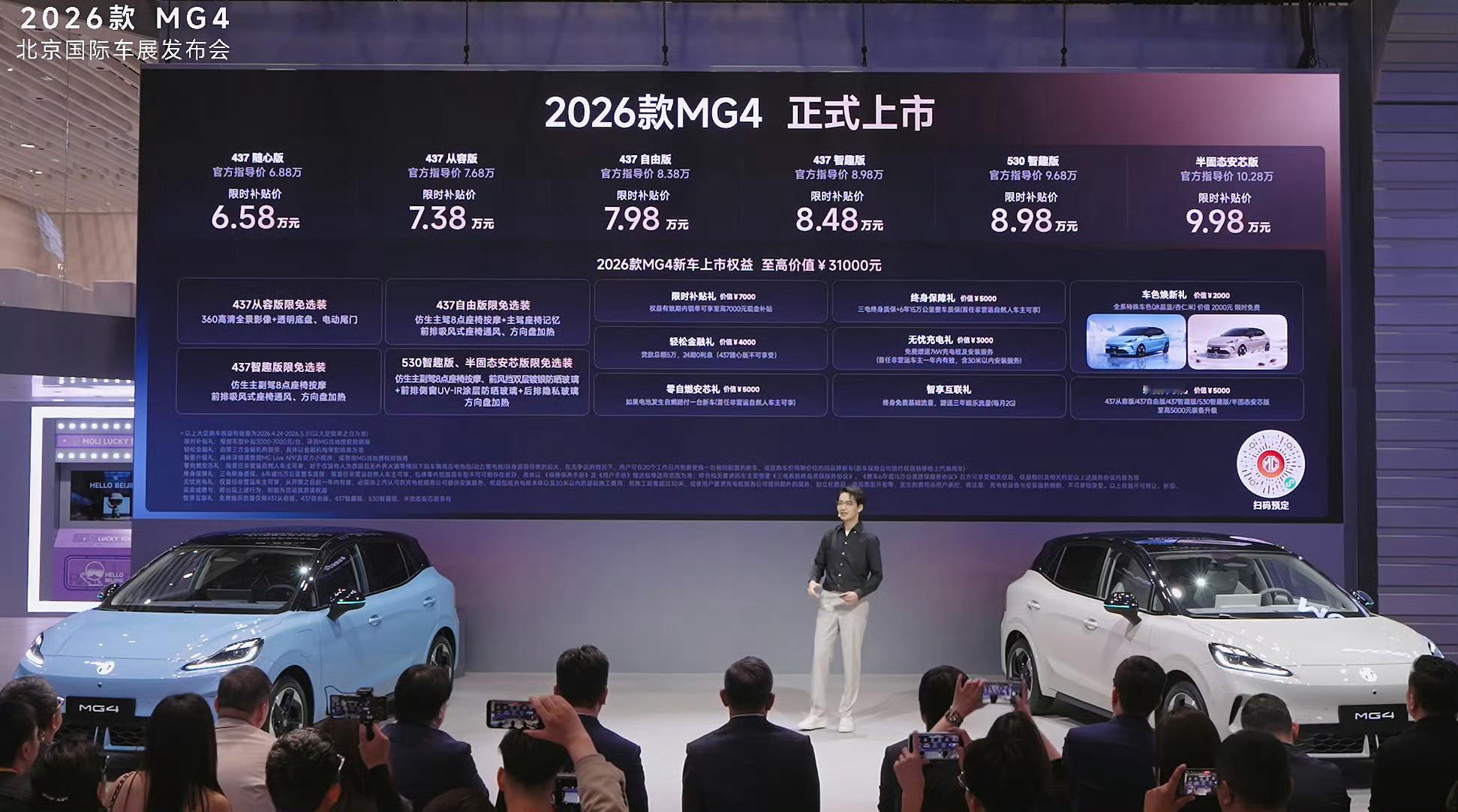 6.58万起!智驾数码团 MG4这波直接把A级纯电卷疯了~谁还敢说10万内没好纯电?2026款MG4 直接杀疯,6.58万起还限时至高7000元权益,性价比直接拉满!MG4 全系标配120kW电机,437/530km双续航可选,同级独有的CTB车身一体化技术+半固态电池,技术直接越级。冰晶蓝、杏仁米新配色+悬浮车顶,颜值党狂喜。前排加热通风按摩、OPPO车机互联、地平线智驾全给安排上,底盘还有中欧团队调校+VMC稳控系统,10万级纯电,这次MG4真的没对手了。