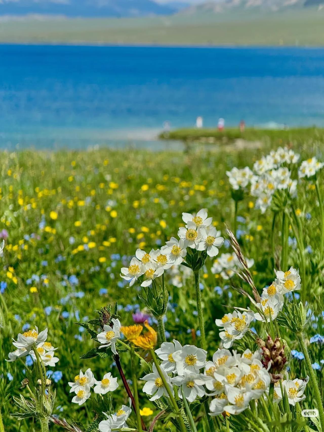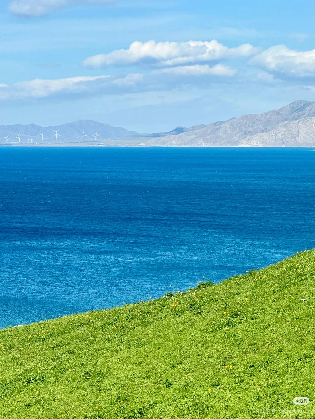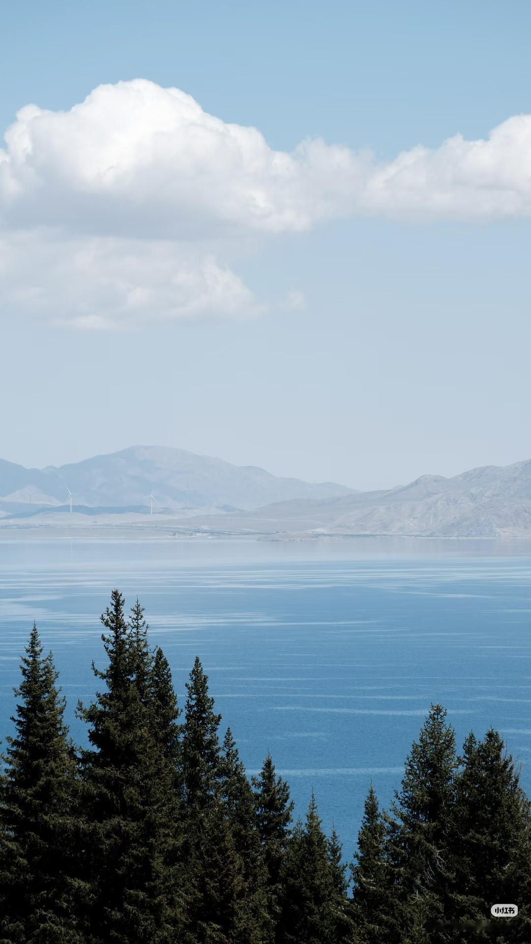 第一个停车点,沿着栈道走到湖边,可以看到雪山,草地,风车,看塞湖东岸3600米主峰。