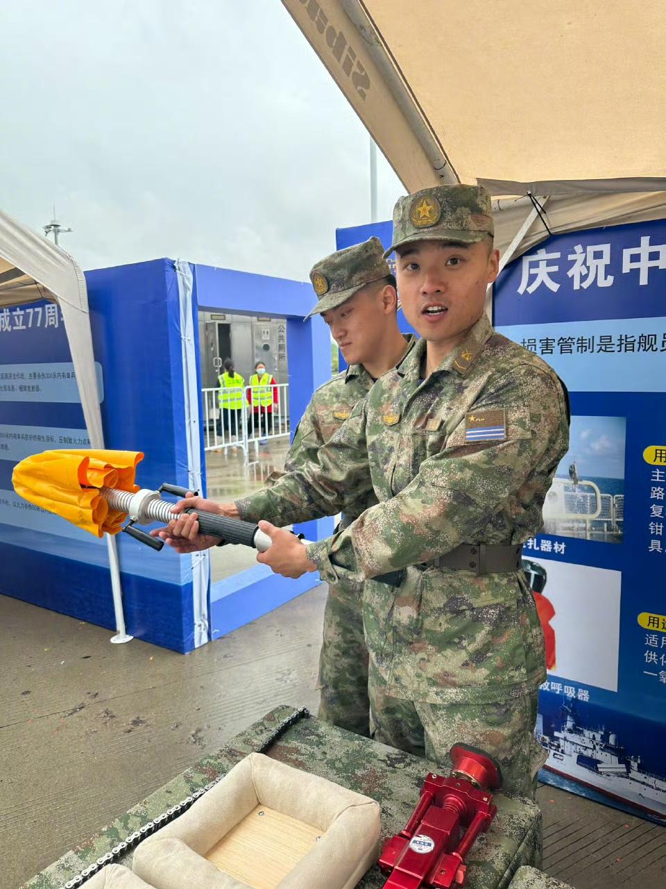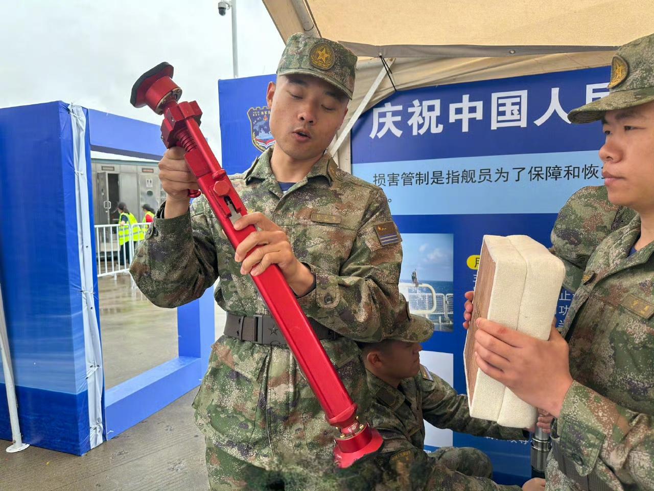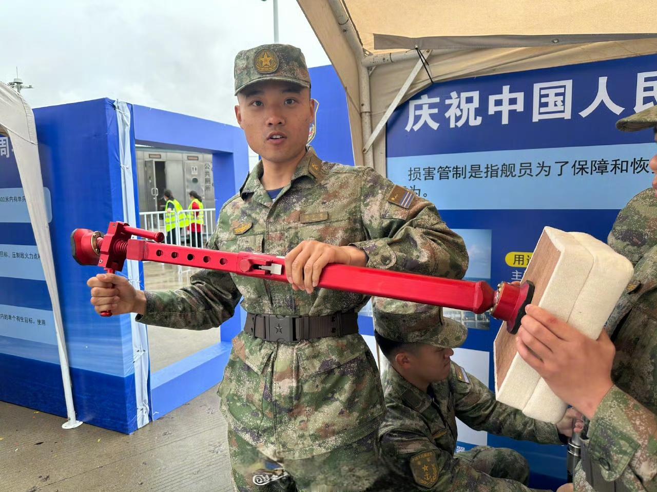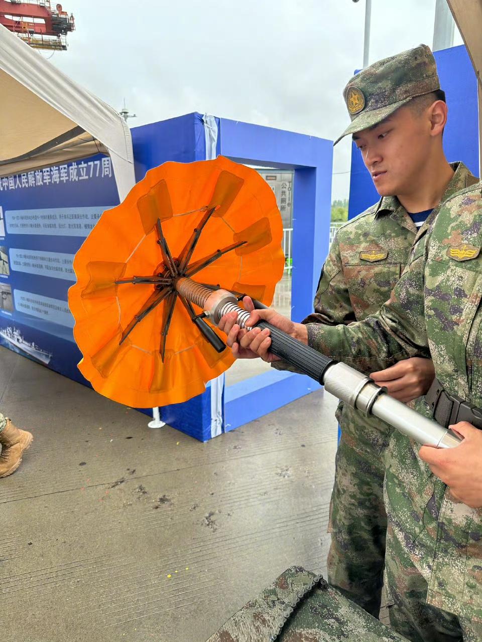 人民海军成立77周年上!中国海军俄制956EM型驱逐舰“泰州舰”(舷号138)上官兵展示损害管制设备,堵漏撑像一把小伞、对准舱壁上的破口插进去,然后啪的一下张开,借助弹簧的压力撑满整个破口。