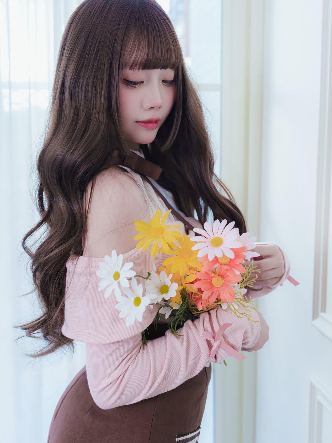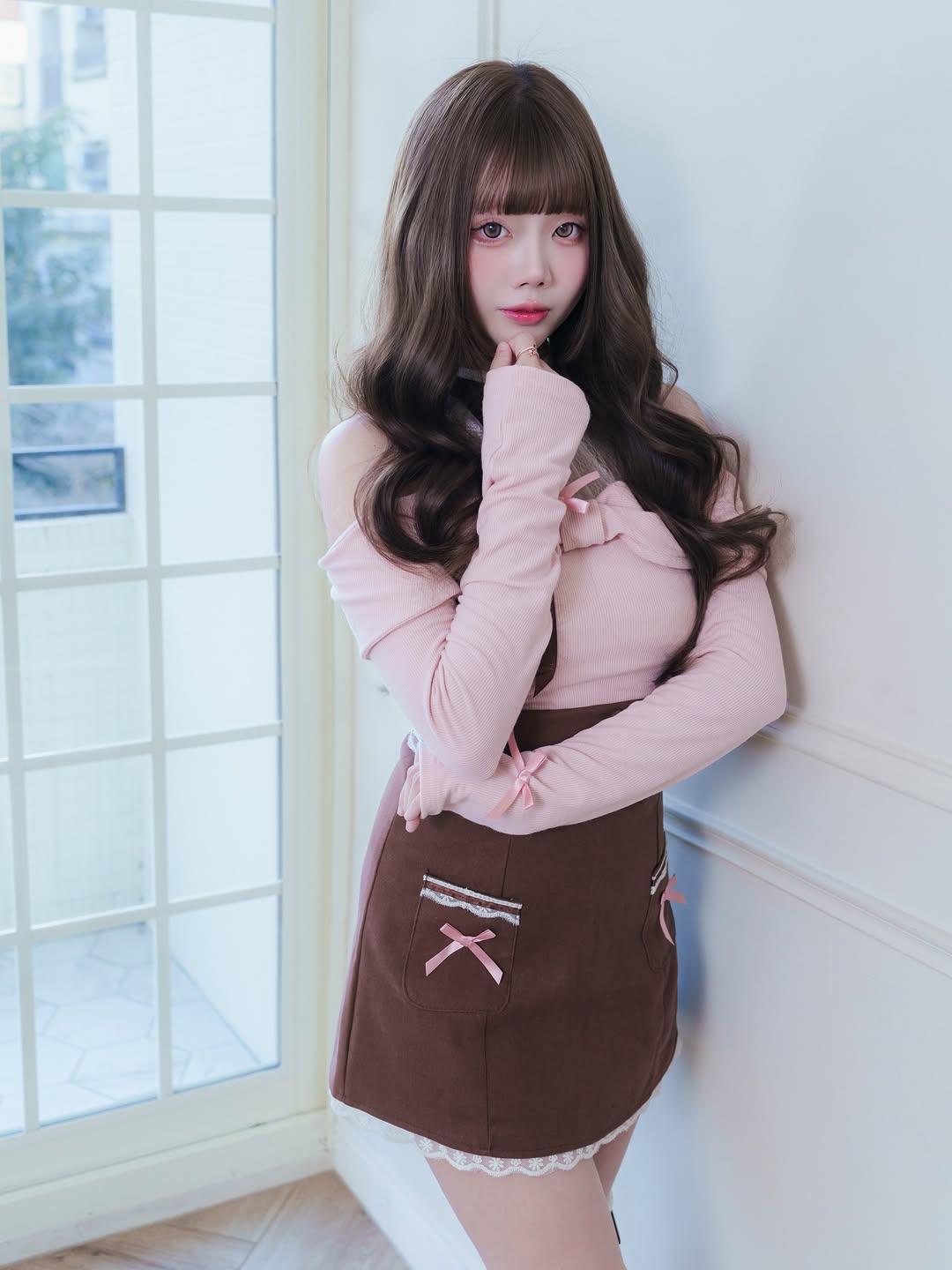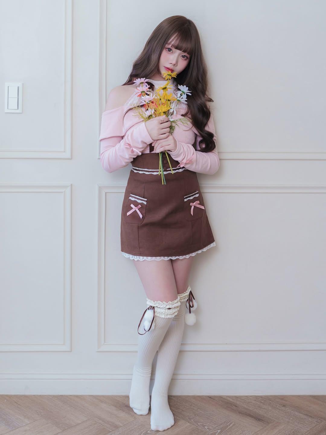 露肩粉上衣+蕾丝边棕短裙,软乎乎的又甜又乖