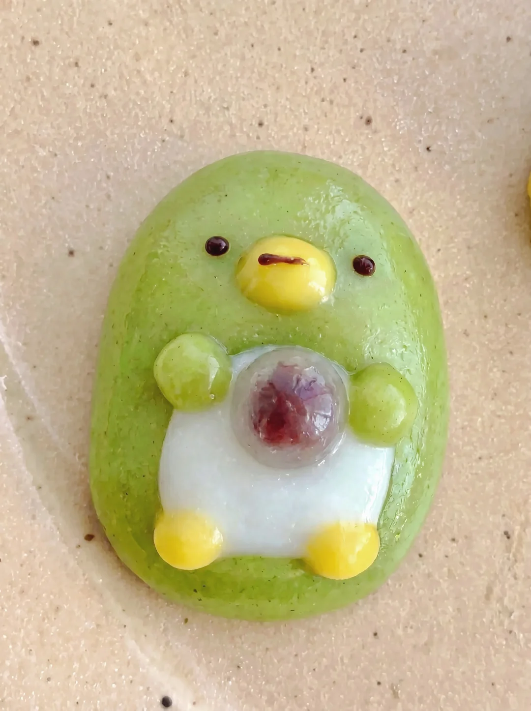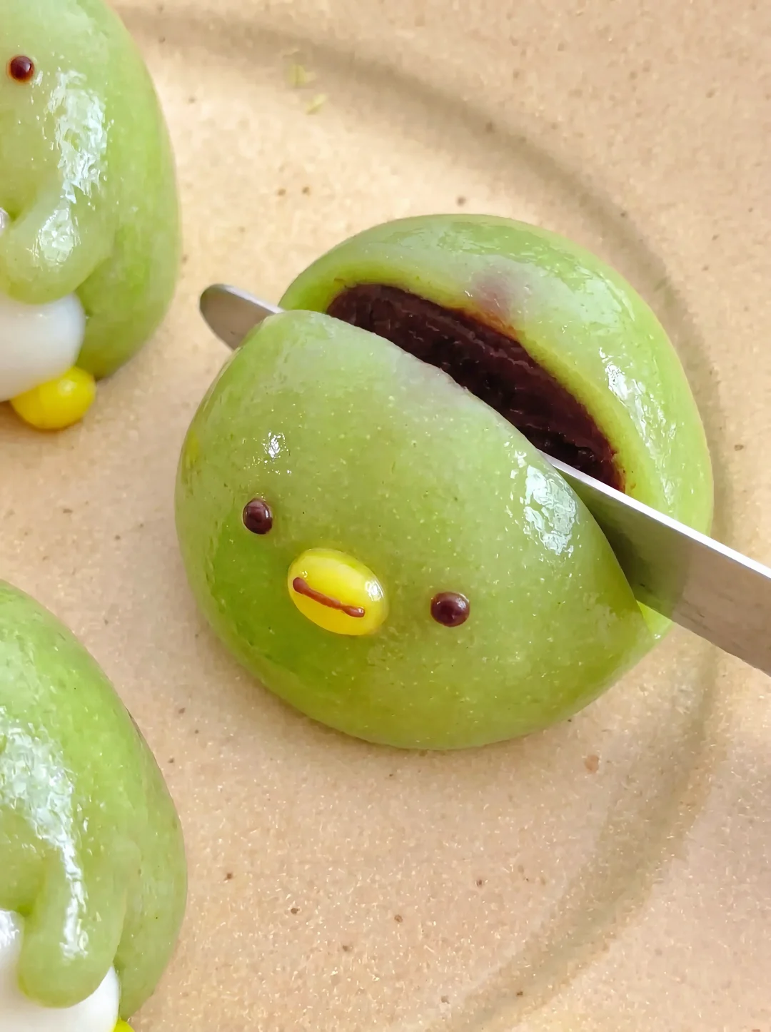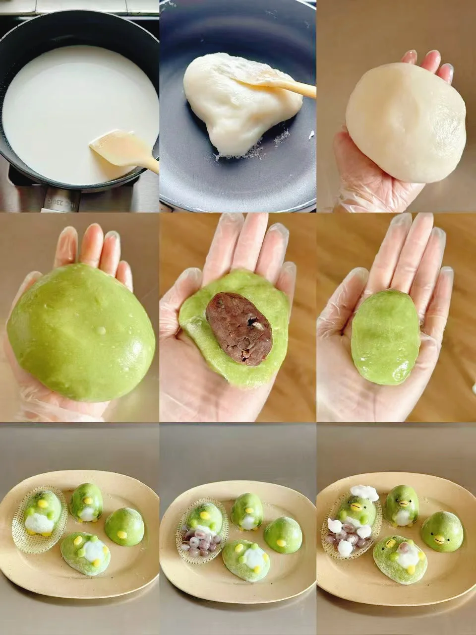 5️⃣将大福整成绿鹅的造型,最后用巧克力画上眼睛就可以啦