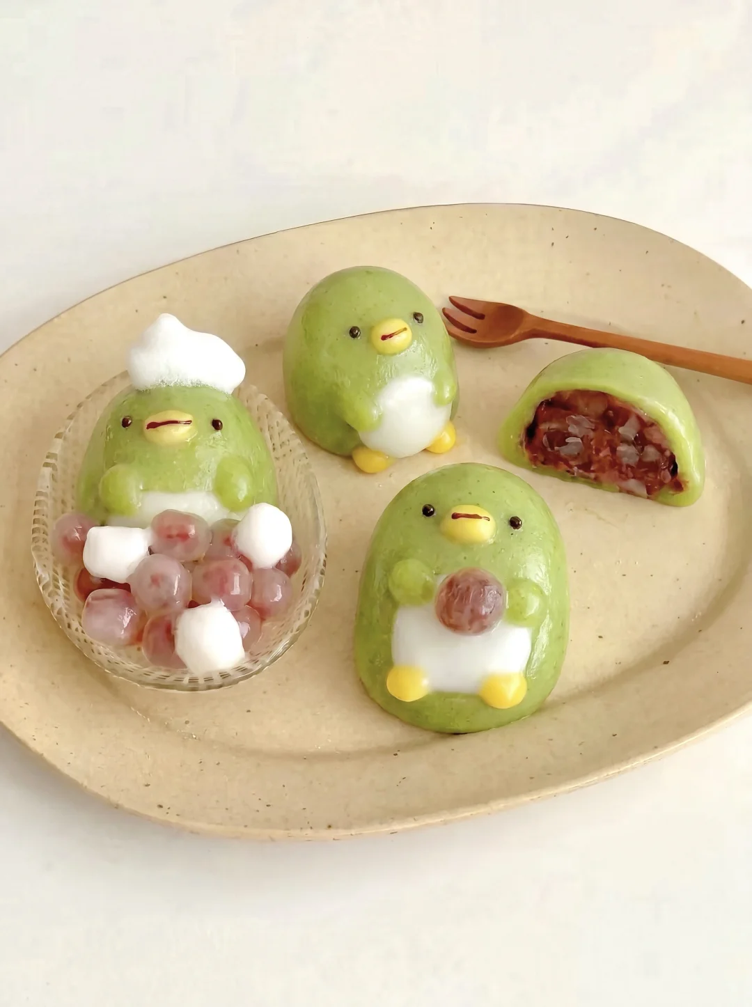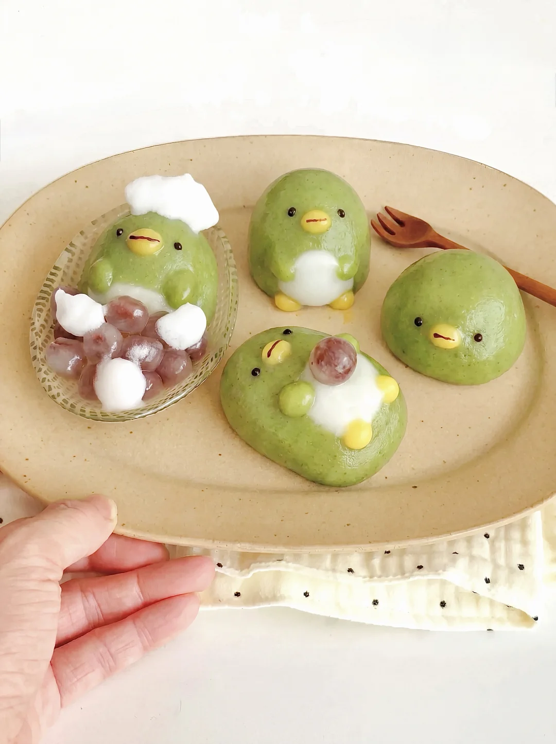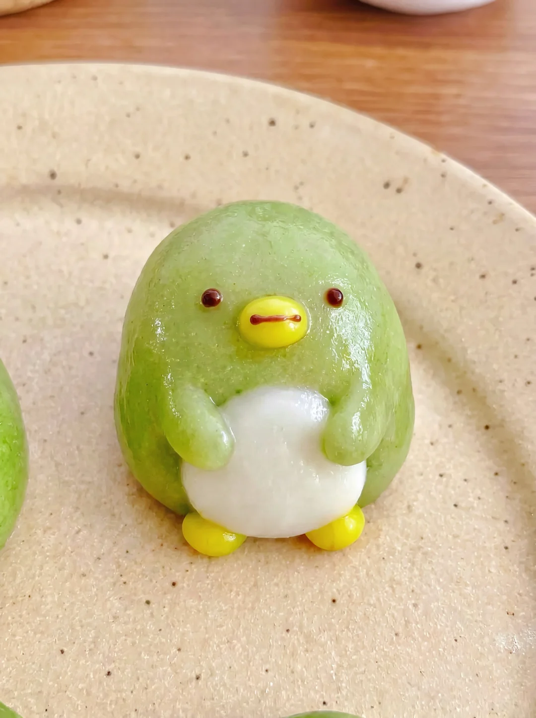 5️⃣将大福整成绿鹅的造型,最后用巧克力画上眼睛就可以啦