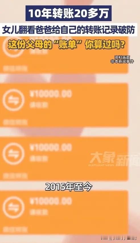 从十年前她离开家去外地上大学开始,到后来工作、结婚、生子,每一个关键阶段,父亲的转账从未间断。