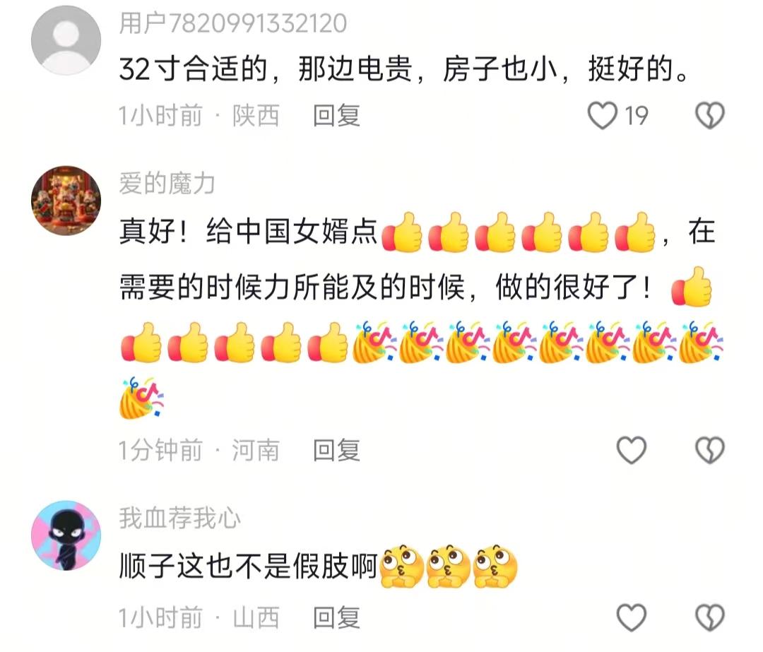 然后评论区真的给我看乐了,有人说人家媳妇生三个娃,该买;有人吐槽太小了,怎么也得50寸;有人说顺子太棒了,加油回国买房;甚至有网友说要把自己闲置的电视寄过去,哎呀妈呀,真的啥人都有。之前我就因为买东西被网友杠过,那叫一个郁闷,真的没意思。