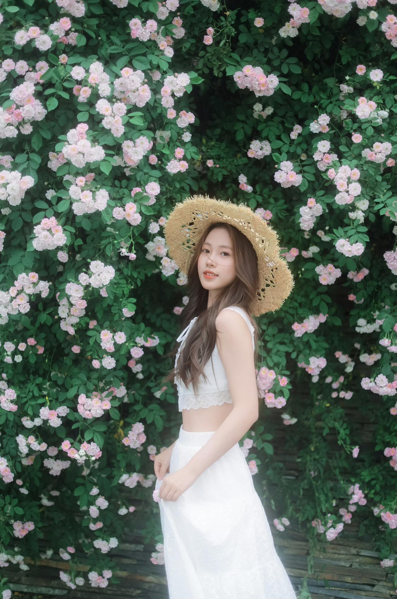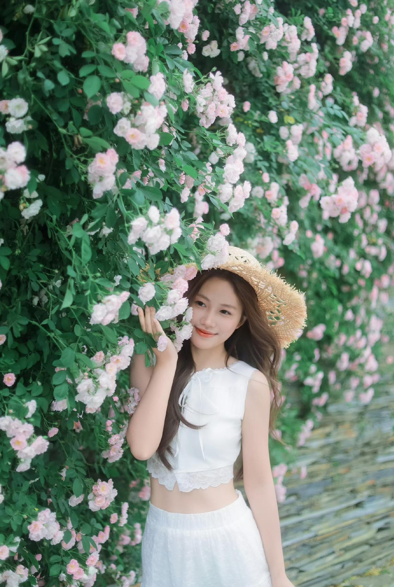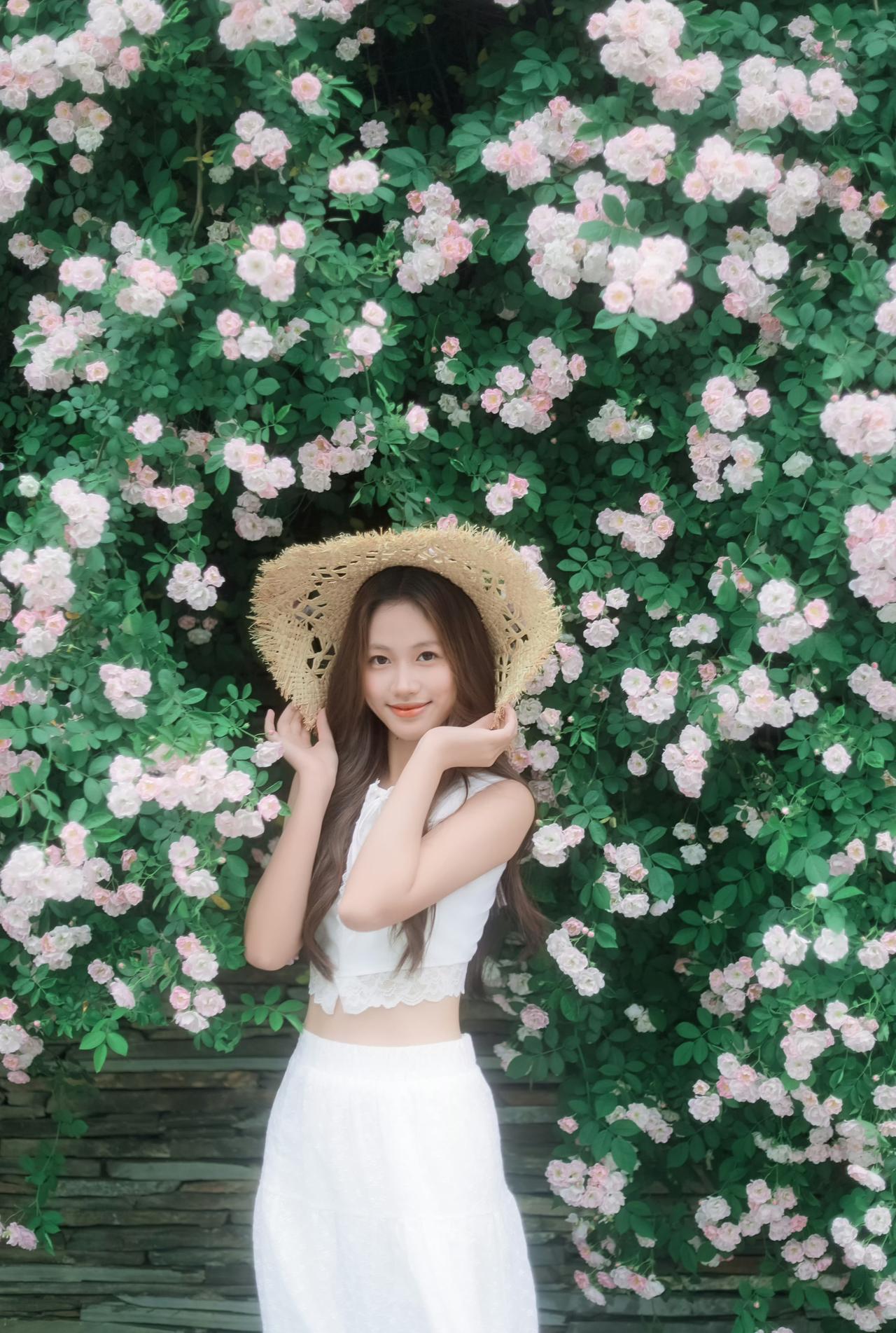 一身洁白裙摆,一顶草帽轻晃, 在满墙温柔蔷薇花海里, 连呼吸都染上了清甜的春日气