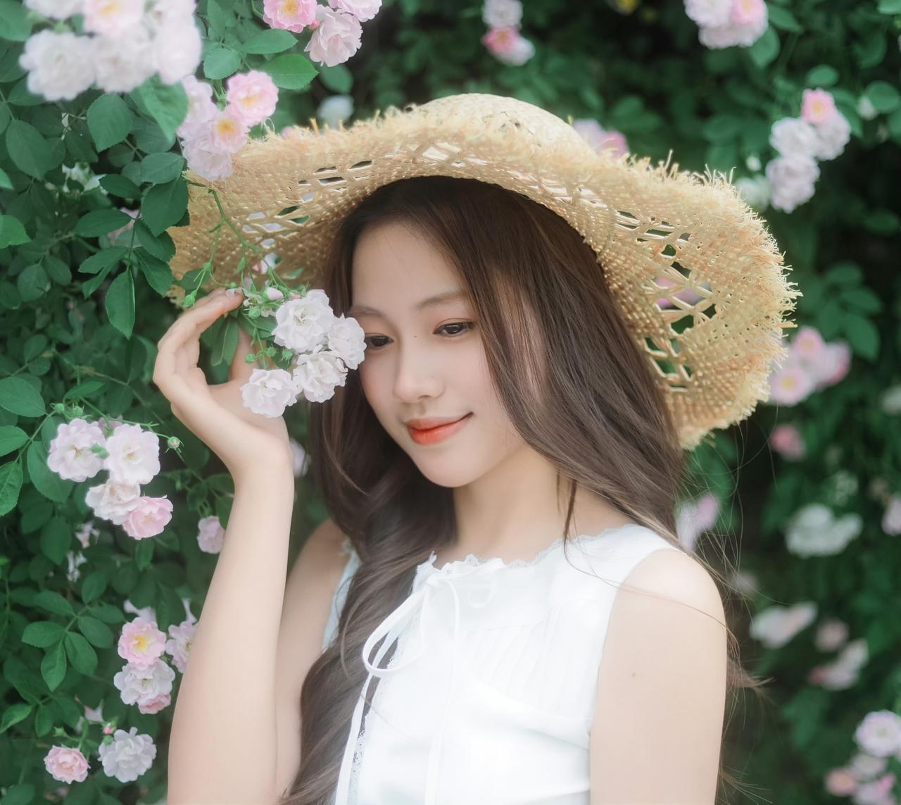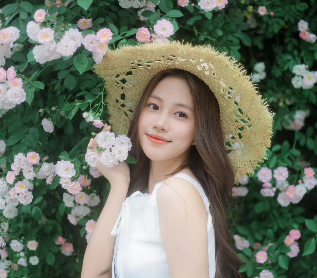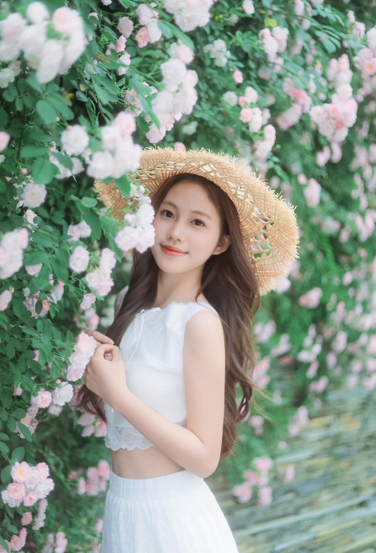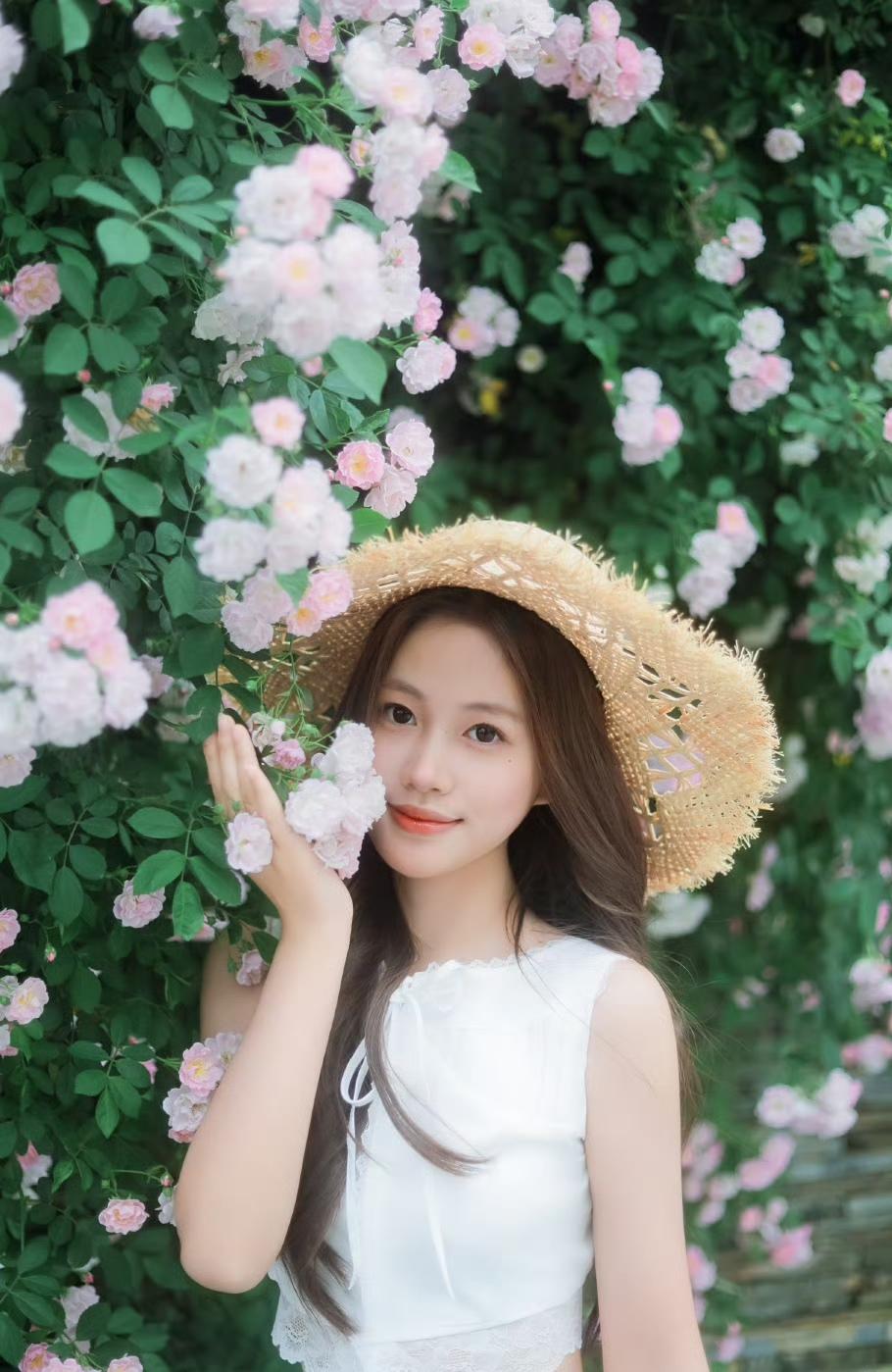 一身洁白裙摆,一顶草帽轻晃, 在满墙温柔蔷薇花海里, 连呼吸都染上了清甜的春日气